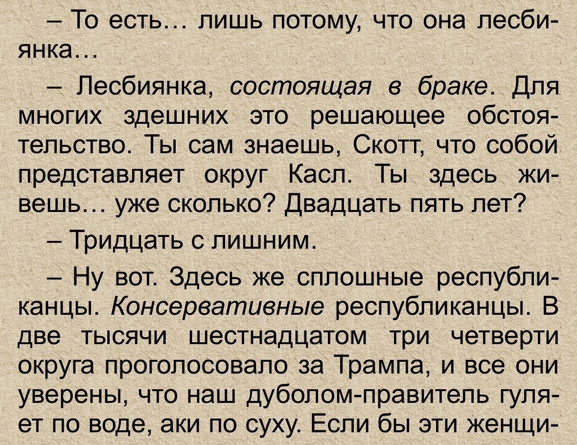 Начал читать Спящих Красавиц, аннотация понравилась. И тут такая тугая струя повесточки началась, трудно эту хуйню воспринимать, хотя сюжет интересный. Я, конечно, знал, что Кинг левак, но это совсем пиздец, такое словоблудие. Это соавтор в виде сынка так повлиял? Сказал бы отцу лучше "не, бать, это совсем хуйня, ты че, совсем ебнулся?". В Чужаке, например, тоже повестка была (смотрел сериал), но не до такой степени.
