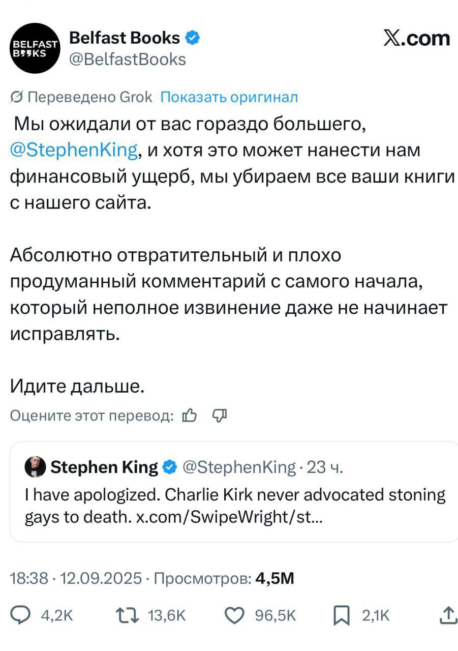 - 27 мая, в продаже появился новый роман Стивена Кинга — «Never Flinch», который сразу занял первую строчку в рейтинге самых продаваемых новинок на Amazon.