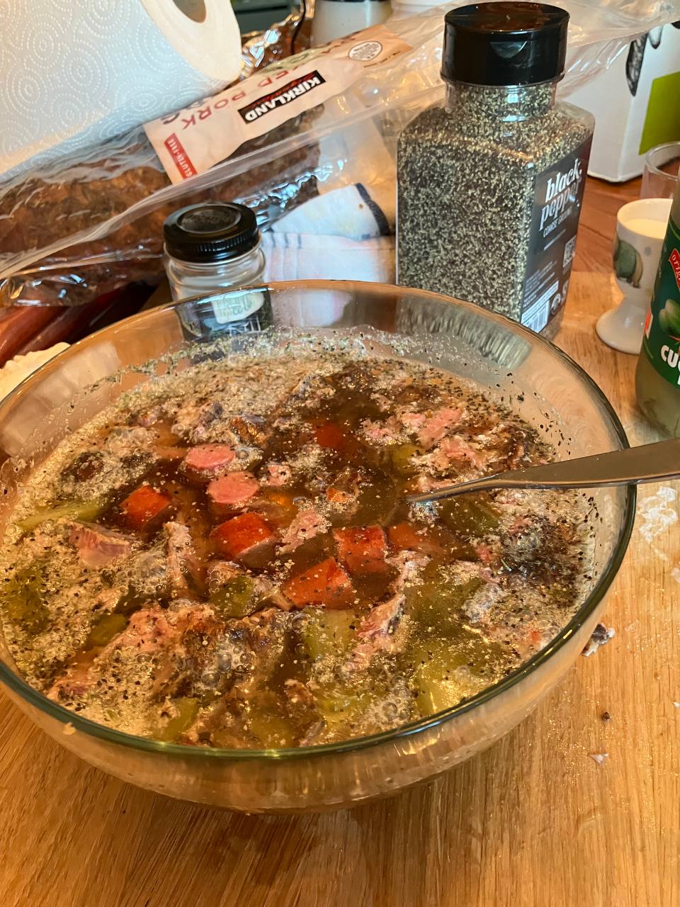 Летний суп пивной (должно быть, хорош с похмелья, но его, как и опьянения, не испытывал давно). Светлое пиво, охотничьи колбаски, копченые ребра, соленые огурцы, соль и перец по вкусу, специи по желанию.