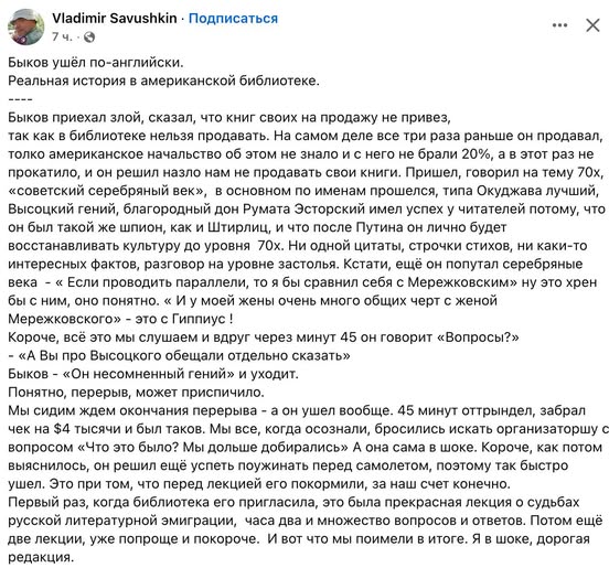 Тем, кто тоже тоскует по старым БЫКОВ-ТРЕДАМ, могу предложить ознакомиться с рассказом Александра Соболева (который "Грифоны охраняют лиру" написал") "Мы забываем о деревьях", в котором забавно выводится образ Быкова в лице некоего Юкина, да и в целом высмеивается столичная прогрессивная гуманитарная тусовка.
