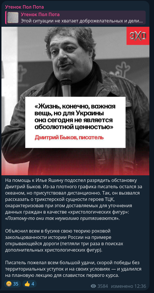 >>1026136 Лол, Лучшая Часть Аудитория послала Дмитро нахуй с его "Зеленским", сколько бы он там русских говном ни поливал, и теперь Быков решил зайти из-под прокси-хохла.