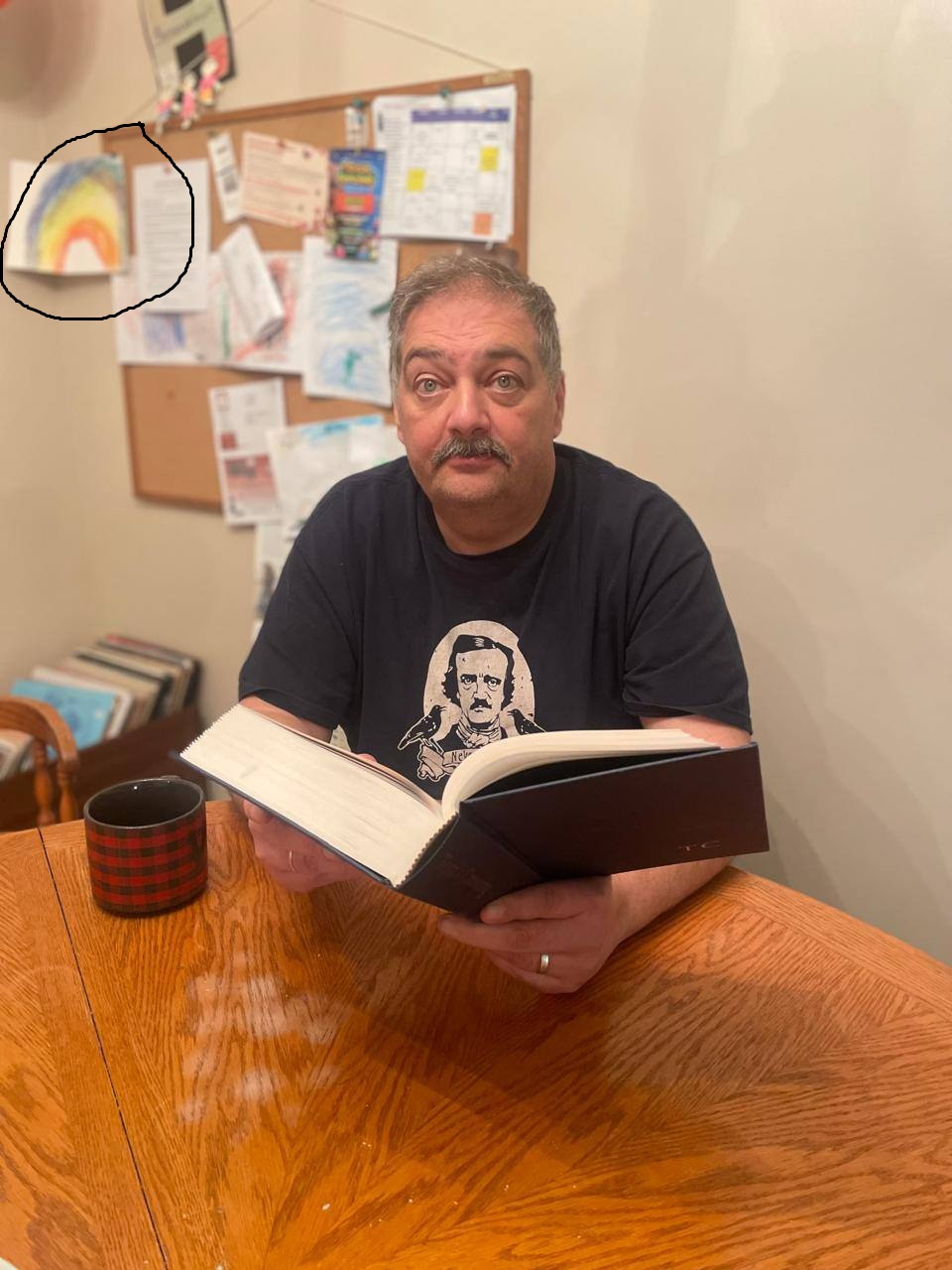 >>1033415 Мужчина справа: С кудрявыми волосами и усами, одет в темную футболку под джинсовым жилетом. Он смеется, глядя вверх, и держит в руке необычную керамическую кружку или бутылку в виде человечка в шляпе с красными «шарами» (возможно, помидорами) вместо ног. На безымянном пальце левой руки у него кольцо.