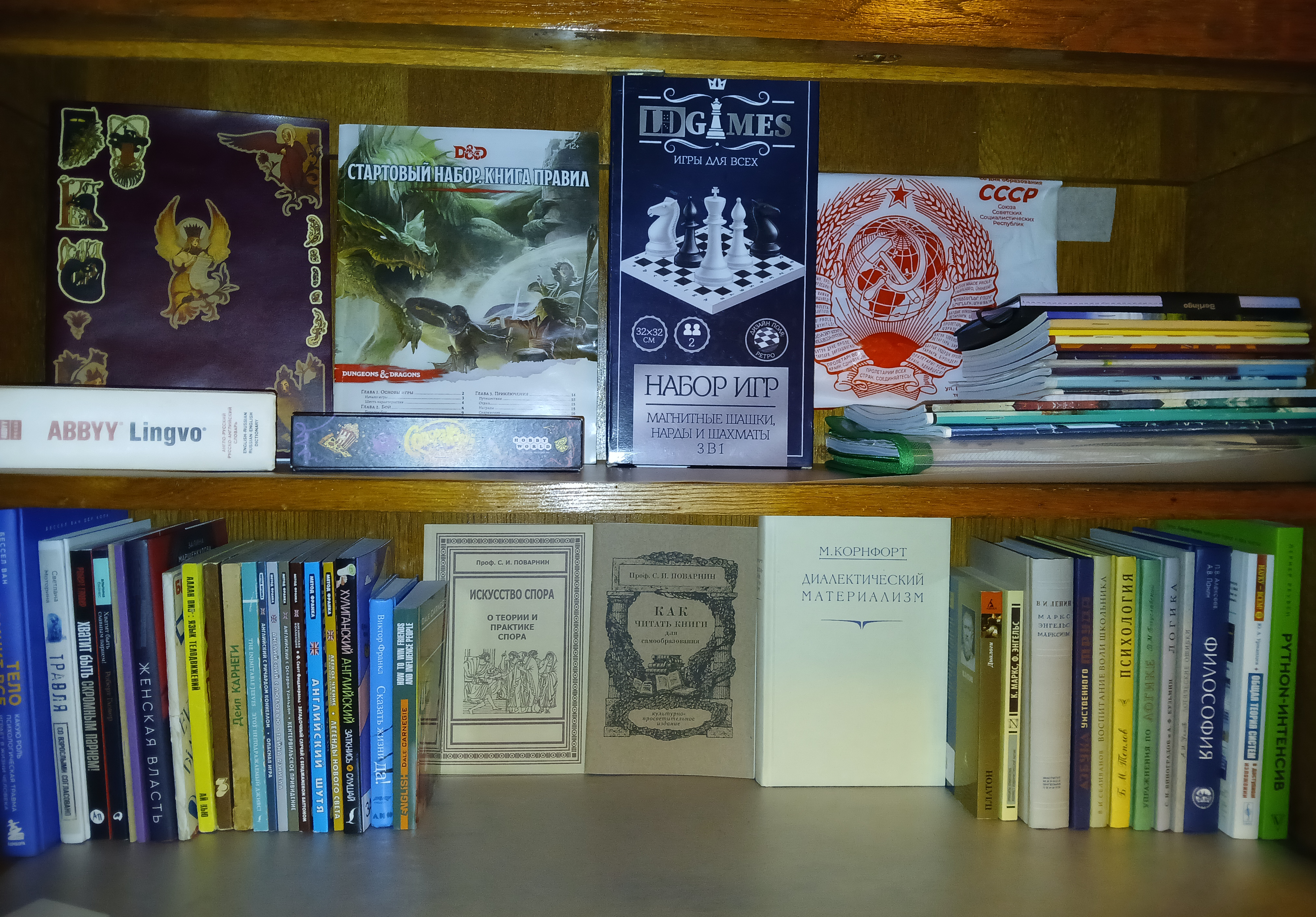 Обычно словарь лежит у меня на столе, а книги в шкафу стоят как на втором пике. Но там как можете видеть - в центре пустое место. Вот всё думаю чем можно его заполнить. Может фигуркой какой или книгой. Пока ещё не знаю.