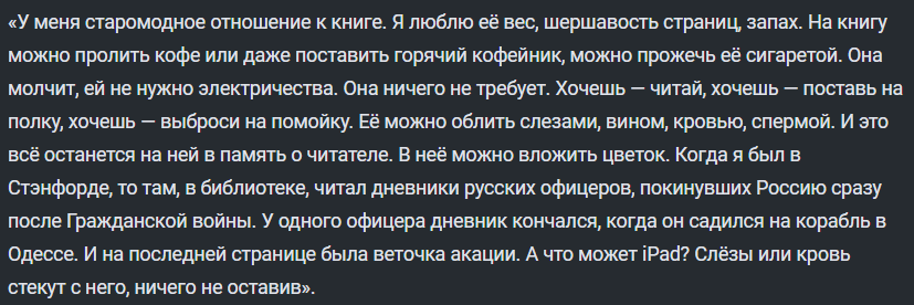 >>1034617 Правильно, на то и есть книги, чтобы об них сопли, жопу или ноги вытирать. Об этом ещё Сорокин говорил как о преимуществе бумажной книги перед цифрой: Книгу можно окропить слезами, кровью, спермой, на неё можно поставить чайник, об неё можно затушить окурок, в неё можно харкнуть, блевануть, нассать на неё. А что будет, если нассать на айфон? Моча просто стечёт с экрана, совсем не то. Вот то ли дело книга! Между страницами можно заложить веточку, бабочку, какашечку, использованный тампон. Можно кусать книгу в процессе чтения, просовывать эрегированный член между страниц, совершать с книгой фрикции, можно водить по страницам анусом. Разве это не чудо? На то и существуют книги, живое общение с буквой.