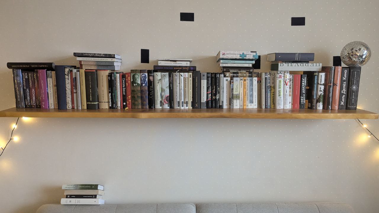 Признаюсь, что у меня тоже есть подвесная этажерка на один ряд книг, но она была сделана ещё в советское время впихивания в узкий коридор или на не занятую стенку над диваном.