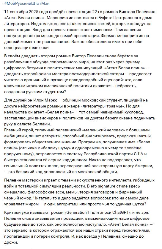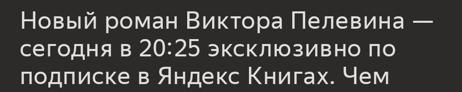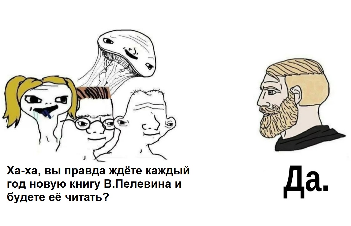 Интересно, радуется ли Пелевин сейчас своей молчаливости и незаметности, благодаря которой его не закинут в иноагенты? По-моему, чтобы быть популярным российским писателем и не быть иноагентом (быков, сорокин, акунин, улицкая) нужно либо подсоснуть Пыне, как Елизаров, либо быть писателем второго эшелона, как Михайлов или какой-нибудь Шишкин-Водолазкин. А Витя ловко придумал. Вот и от молчанки дивиденды. P.S. Теория шаткая и натянутая, можете об этом не писать. Тот же Водолазкин и Шишкин популярнее Елизарова, если брать тиражи и цитируемость, а не мемность на дваче. И обоих спасает то, что это бабская интеллектуальная литература без претензий, там крамолу надо старательно откапывать.