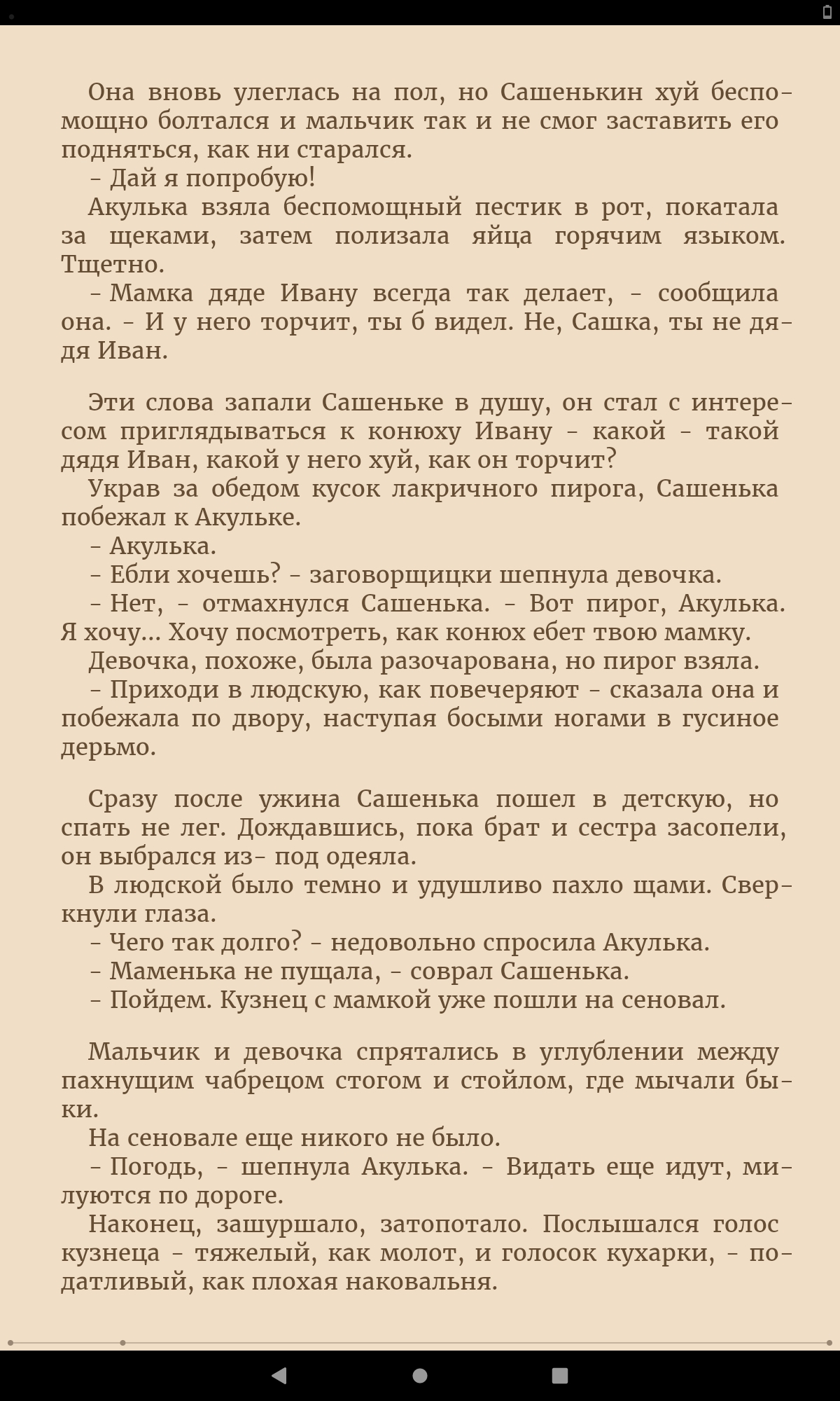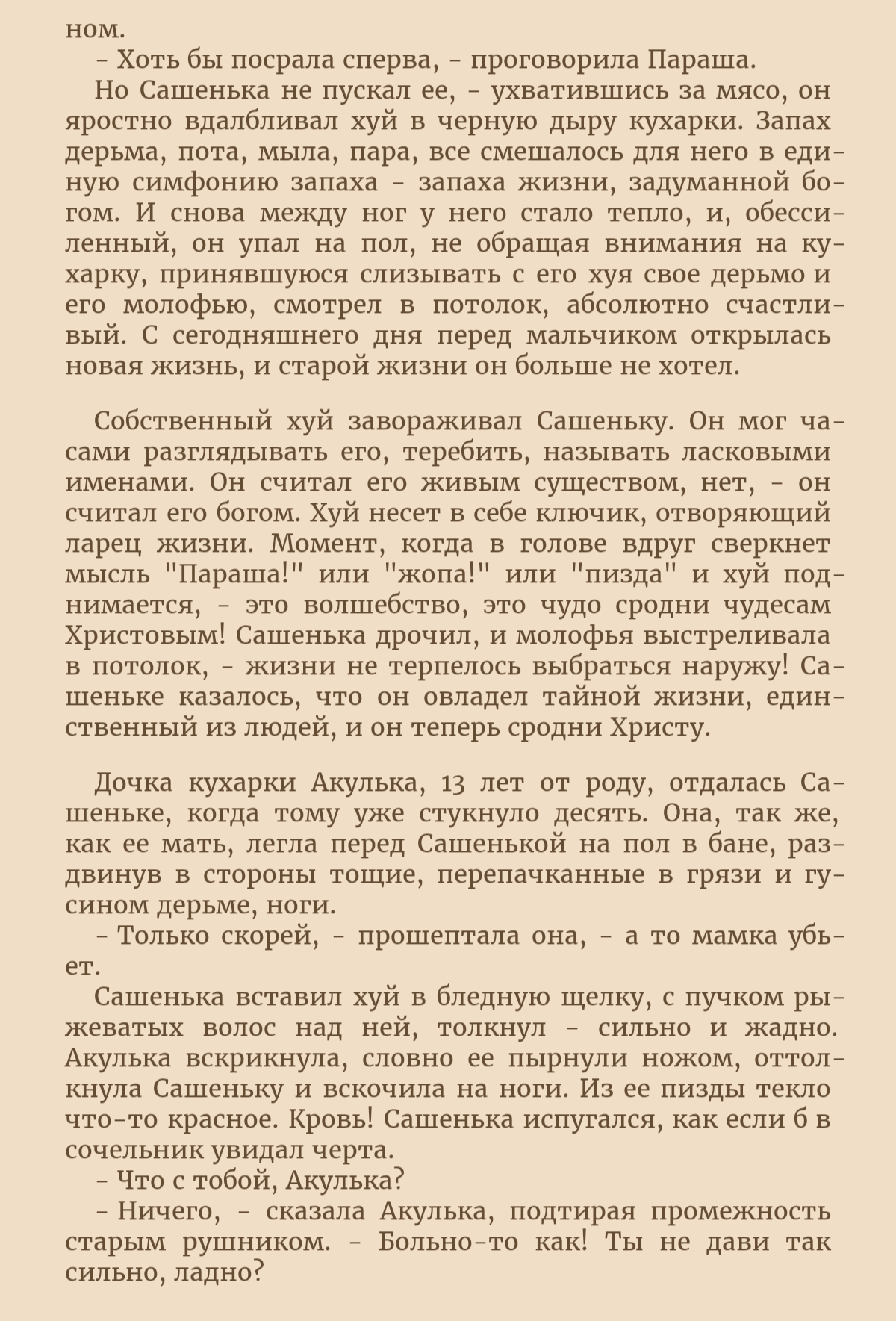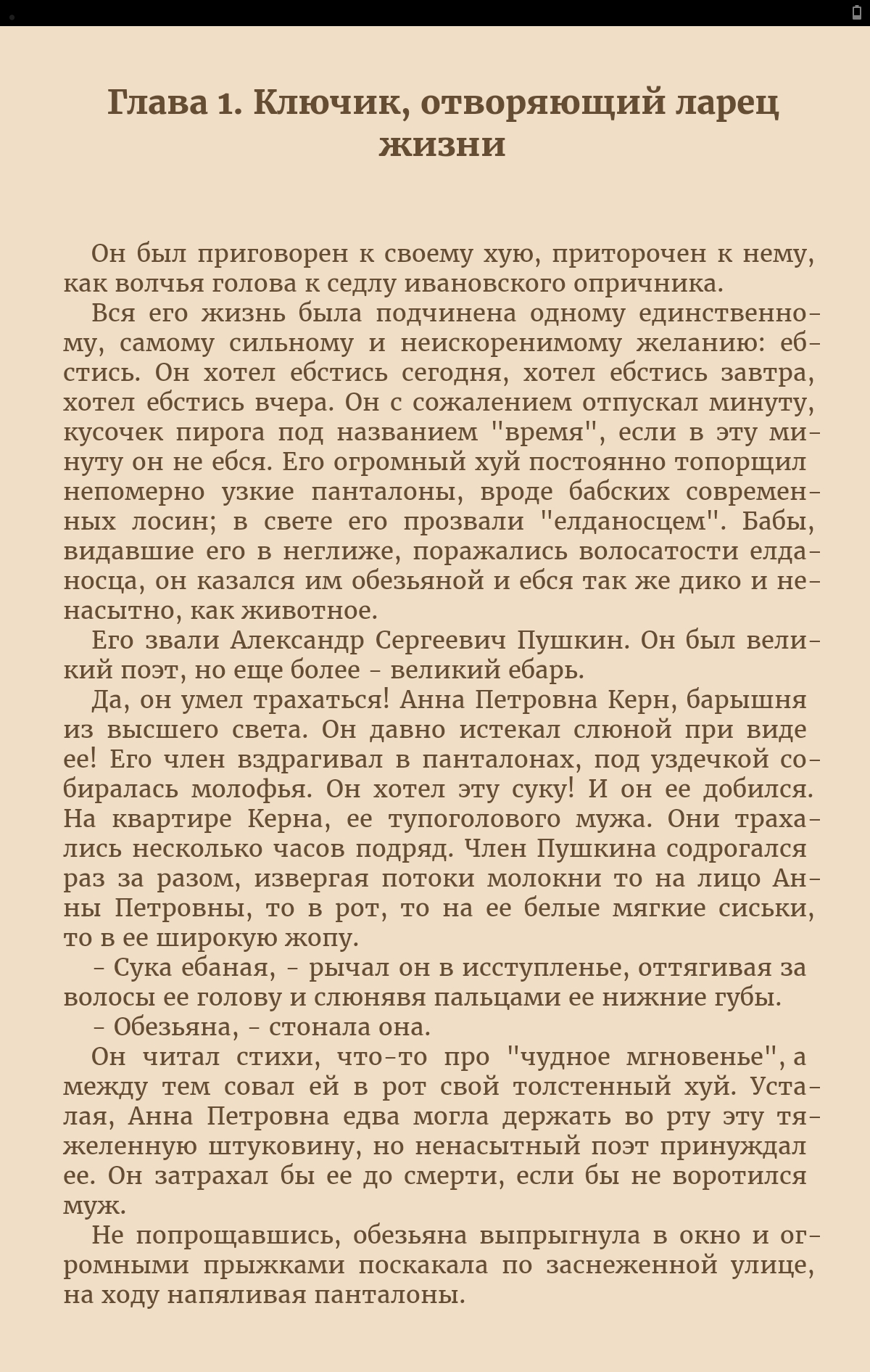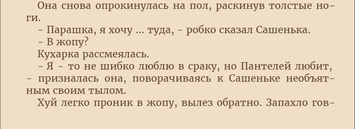 >>1027277 Поколение П в мятой обложке. На хате тусили, забегали две подруги, одна с книгой. Я спросил что за книга, а она просто дала ее и типа сам смотри. Потом они по банке опустили и побежали на пары. Я за ночь прочитал на хате половину. Все бухали а я читал на диване. Ржал аки конь и смыслы тогда казались там были эпические. А на следующий вечер они опять пришли, а осень была и отопление еще не включили, по этому я занял маленькую комнату и погрузился в чтение. К вечеру еще похолодало, я одеяло в шкафу надыбал и читаю дальше. Тут заходит моя библиотекарша и под одеяло ко мне шмыг. Холодная вся что пиздец, аж трусит. Спросила сколько прочел, я ей показал что уже конец почти, удивилась такая, в глаза посмотрела и пару вопросов задала по сюжету, я ответил, а она сильнее прижимается и руки мне под футболку засовывает, а ноги своими оплетает, пол часа и пойду, говорит, дочитывай книгу надо вернуть. Я дочитываю а у самого шишка начинает дымить, что аж одеяло поднялось. Она книжку так рукой опускает, глазами ловит мой и подносит свое лицо близко ко мне, нежно целует и шепчет на ухо, чтобы я закрыл дверь. Ну, а потом поебалися! Быстро так, мы десять минут всего ебалися-то…