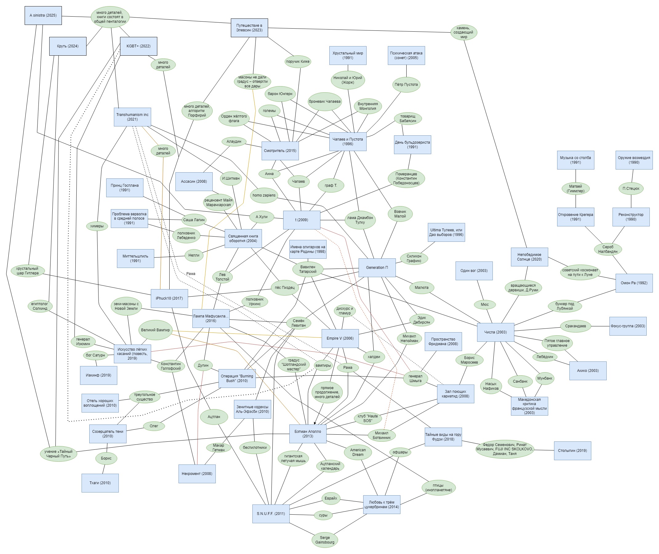 Только там есть барон Юнгерн. Я это с прошлой схемы скопировал (я не с нуля схему создавал, а только последние книги). Это ошибка? Он барон Унгерн? Он тут указан как присутствующий в Чапаеве и Пустоте и Смотрителе. В Чапаеве он Унгерн, я помню, может в Смотрителе он Юнгерн? Я не помню что там было в Смотрителе.
