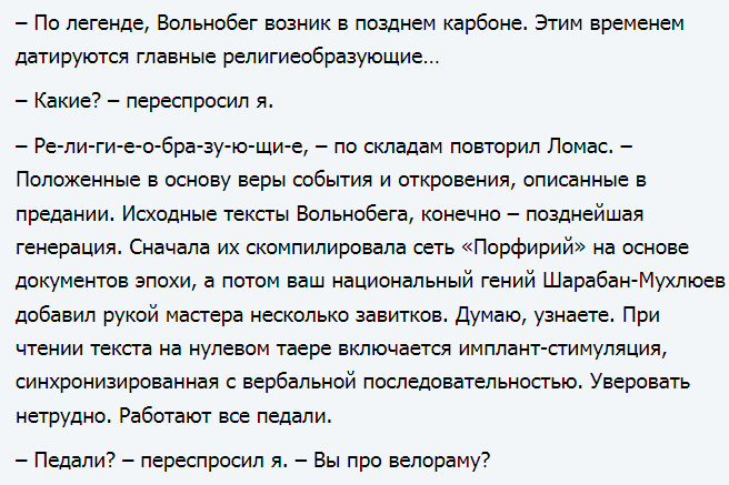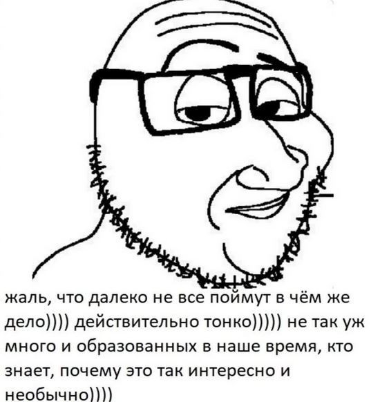 То же самое кстати касается и проработки темы. Взял тему ренессансной западной алхимии и чернокнижия. В итоге одна цитатка из Гермеса, вспомнил пару самых известных имён типа Парацельса и Агриппы ну и тд в таком роде. Даже попытки не было связать тащемто богатый материал в какой-то более-менее атмосферный, я уж не говорю глубокий, текст. А шоб сразу откреститься от того, почему можно писать на отьебись - ну этож нейрогенерация, хули. Справедливости ради, римские романы в этом смысле лучше, видно что Олегычу тема Рима заходит и он в нее значительно больше погружался, хотя Непобедимое Солнце я год читал, только когда было охота "почитать Пелевина". Но таки дочитал же.