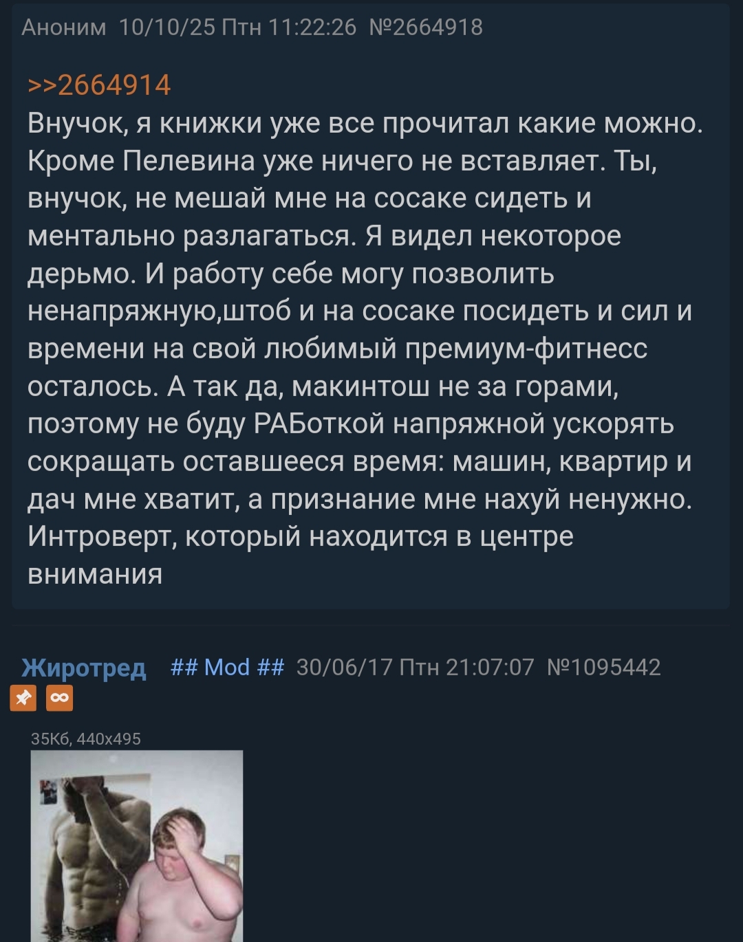Вы вот шутки шутите, вспоминаете Витю с древних фоточек типа мема "ВСРАТЫЙ", его доисторические англоязычные интервью и т.п. Другие пишут про похуиста-буддиста, который весь день бродит по джунглям, медитирует и кайфует, а перед сном на отъебись пишет очередные двадцать страниц. А мне почему-то кажется, что там уже года три-четыре сидит за компом шизофренирующий пизданутый старик, который запутался в своих манямирах, мнит себя Леонидом Леоновым, искренне хихикает над своими уёбищными шутками, периодически передёргивает на какое-нибудь крайне специфичное, но всё же легальное порно (типа засовывания шнурков в нос и вытягивания через рот) и иногда грустит о том, по какому писательскому пути решил пойти.