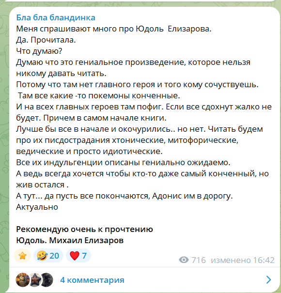 Дочитал "Юдоль", не понравилось, 2,5\5. Единственный плюс - это относительно лёгкий слог, читается легко, но так же легко и забудется. Если начинается ещё более-менее, то с середины превращается в скучную поебень. Водоразделом является сходка бабок и дедов в ДК. Будто сидишь на завалинке в деревне и тебе рассказывают историю, но чем больше водки в рассказчике, тем скучнее и вторичнее. И слушаешь только из-за того, что без окончания потраченного времени будет жаль. Не знаток Елизарова, но Библиотекарь был существенно крепче, Земля уже туда-сюда, но там хотя бы персонажи были объёмными и сюжет неплохой, а тут вообще никто не запомнился, все плоские, как картонка, бытовое колдовство, история уровня школьника, херня прям.