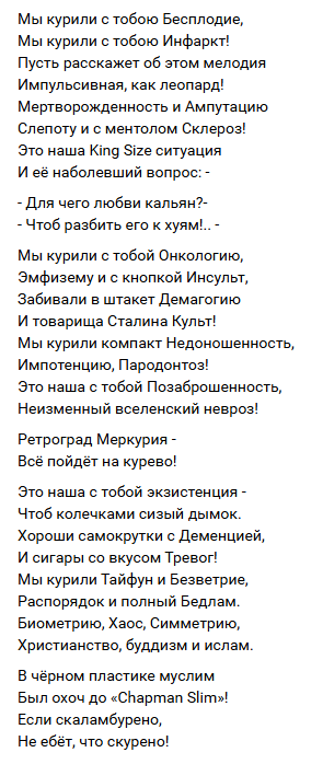>>1034564 Может, лучше песню про то, что не за горами третья мировая? Всеобщее окукливание (не только РФ касается; аналогичные процессы во всех крупных странах идут) - это один из симптомов. Скоро начнется всеобщая пиздорезка спецолимпиада по мерянью патриотизмами. Теми самими патриотизмами и русским имперским духом, про которые мишины дружочки Дугин, Гинтовт и прочая ублюдская черносотенная свора вещает. Да и Миша тоже - про ноктюрны-диурны и прочую хуиту. Чо там, МЮ, мы щас в ноктюрне али в диурне? Охуенно выступим или Цусима впереди? Хотя обывателей это меньше волнует, чем говноМАХ.