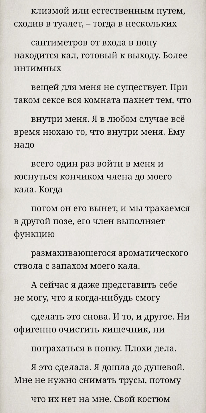 Но мне потребовалось больше: я подумал, что любовь к интимным трубопроводам женщины должна распространяться и на циркулирующее в них сырье — именно в сфере разложения следует соединить кольца в цепочке сменяющих друг друга симпатий. Руководствуясь этим принципом, мы вступили в новый этап наших бесстыдных выходок. Если использовать медицинские термины, я перешел от уролагнии к скатофилии. Уже давно Ребекка, желавшая примирить меня со своими испражнениями, с упреком говорила, что я обожествляю вульву, но пренебрегаю ее соседом по площадке. Я признал несправедливость этого фаворитизма и демократично согласился расширить его границы. Вот каким образом нежная моя подруга научила меня причащаться к ней посредством жидких и твердых выделений: для начала она, сходив на горшок, заставляла меня нюхать и щупать ее колбаски. Выложив их на тарелку, она давала мне вдохнуть этот запах и ближе познакомиться с ними. Затем, двигаясь все дальше, она потребовала, чтобы я вылизывал ее языком сразу после дефекации, разумно рассудив, что наличие отверстия победит мои колебания. Когда она сочла, что мои предубеждения (которые именовала предрассудками) частично преодолены, то решила осуществить полную инициацию. Я сам, из опасения, что меня вырвет, просил покончить с этим раз и навсегда, но предупредил, что смогу подружиться с ее какашками только в состоянии высшей чувственной эйфории. В назначенный день и час Ребекка, которая взяла на себя всю организацию, привязала меня, чтобы я не вздумал сбежать, накачала наркотиками и алкоголем, надела самые чарующие свои украшения, зачесала волосы назад, словно водрузив на голову атласный купол, и надолго занялась ласками, призванными помочь мне расслабиться. Затем, встав спиной, присела на корточки так, что зад нависал над моей головой, а трусики приоткрывали лишь прорезь: я умолял ее бить меня, раздирать в клочья, чтобы телесная боль превозмогла тошноту, я просил устроить нечто дикое, грандиозное, спасающее от ужаса, от панического желания удрать. Ребекка готовила меня к причастию вербально, сопровождая каждые потуги словом, комментируя каждое движение внутренностей. «Кушай, — бормотала она, — я круглая и сверкающая, возрадуйся плодам кишок моих, смакуй меня медленно, кушай грязь, в которую ты когда-нибудь превратишься, кушай свой будущий труп». Я впал в транс, как перед лицом смерти, под лезвием бритвы, меня ожидал то ли обморок, то ли экстаз, я сознавал, что прохожу самое главное испытание. Должно быть, у меня был взгляд человека во власти галлюцинации: в этом отверстии, из которого ко мне сползал целый мир крайностей, я чувствовал близость чудовищных желаний, смутное влечение к субстанциям, сокрытым под теплой кожей, и, полагаю, открыл рот машинально, сглотнув слюну. Хотя тухлые запахи отвращения проникали в мозг, я гнал их, думая о черных цветах, расцветающих в чреве моей любовницы, обо всей этой ночи, за которую она одарит меня баснословными букетами. Было нечто страшное в том, как слепой глазок в ее заду безмерно расширился и обе ягодицы раздвинулись в ужасном усилии, чтобы внезапно извергнуть из себя, на манер какой-то вялой стрелы, гигантскую колбасу. На секунду у меня возникло ощущение — по правде говоря, комическое, — что зад просто показывает язык, что добрячок натягивает мне нос, а затем эта штуковина с