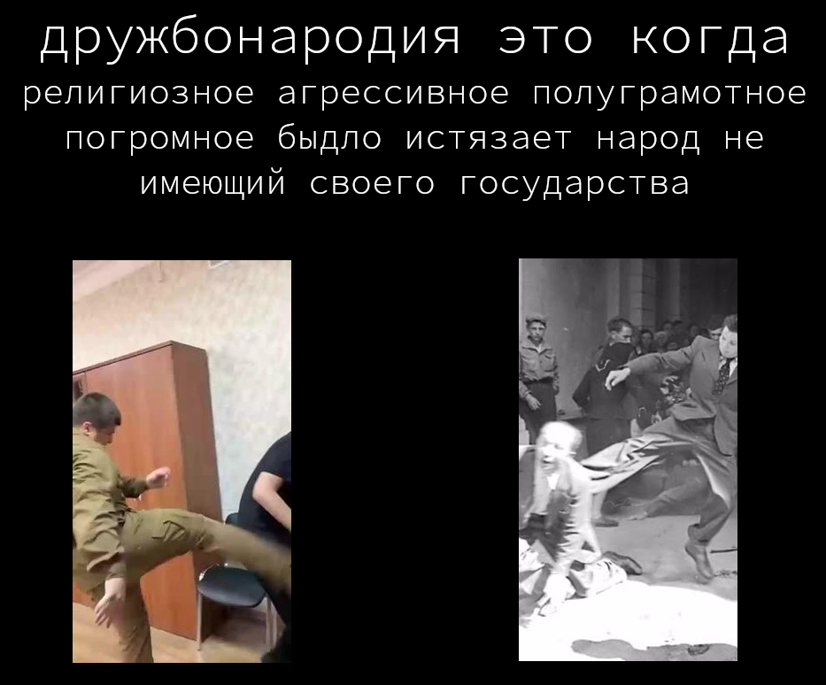 >>1025468 а не надо было оккупировать испанию и русь, не надо было триста лет угонять русских людей в рабство, не надо было грабить и насиловать, не надо было резать русских в девяностые, не надо было резать русских при путинизме - и не было бы "фанатизма". "фанатизмом" ты называешь ответную реакцию на средневекового ордынского садиста который насилует четырёхлетних детей как в обнинске в июле этого года это сделали два малолетних ордынца. а на деле это просто иммунная реакция на ненасытную ордынскую глисту которая за 250 лет ига отнимает всё что есть и разваливается на кучу воюющих ханств потому что без паразитизма на русских глиста жить неспособна.