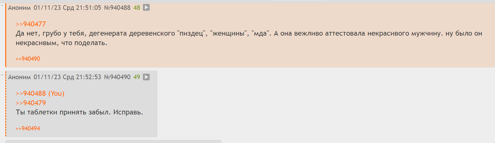 >>940477 Да нет, грубо у тебя, дегенерата деревенского "пиздец", "женщины", "мда". А она вежливо аттестовала некрасивого мужчину. ну было он некрасивым, что поделать.