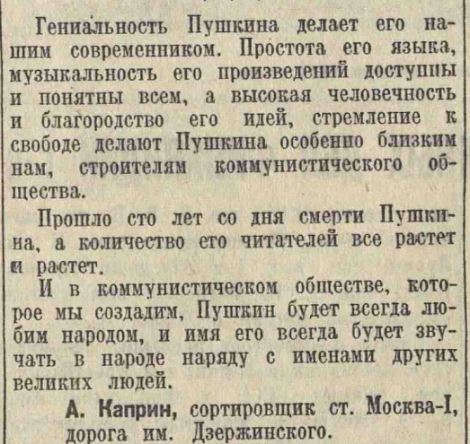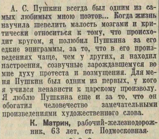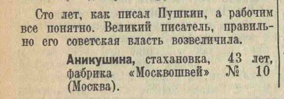 Вообще, аноны, ИРЛ, если вас спрашивают про Пушкина - следите за тем, что говорите. Пушкин это база культуры, и когда вы начинаете говорить эджи ерунды типа "ря негр тупой реперок толи дело слава кпсс))" то становится видно все - образование, повадки, примерное будущее субъекта. Разговоры о пушкине это всегда разговоры о вечности - точнее, о себе. В вечности.