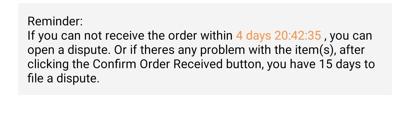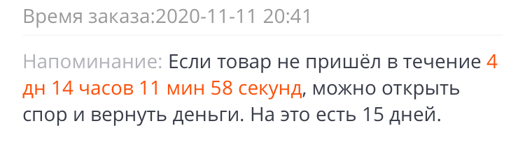 Так вот, если зайти в сам заказ, там будет указано, что сроки доставки 35-35 дней, а если зайти на страницу товара, то уже указано 75-75 дней - это первая непонятка. И вторая - написано следующее Если ваш заказ не будет доставлен к 2021-02-09 , вы можете открыть спор и запросить возврат платежа, вот только эта дата - автоматическое подтверждение заказа и кнопки открыть спор уже не будет.