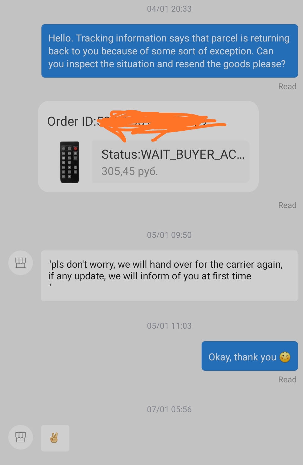Пришёл жаловаться Вот вроде заказал в январе штуку, по средней цене, и наибольшим числом заказов. Посылка вернулась к продавцу с ошибкой на сортировке, я сразу отписал и попросил переотправить (такое уже было в ноябре с другим заказом, может, из-за батареек или ещё из-за чего). Китаец написал, что все ок. Весь февраль я спокойно жил свою жизнь и помнил о посылке, но в конце решил спросить, как она там. А он такой - ПРЕДСТАВЛЯЕТЕ, ОНА ВЕРНУЛАСЬ. ХОТИТЕ ПЕРЕОТПРАВЛЮ? Сейчас ещё схему какую-то втирает с диспутом. Написал, чтобы он добавил ещё один трек к заказу и продлил время защиты.
