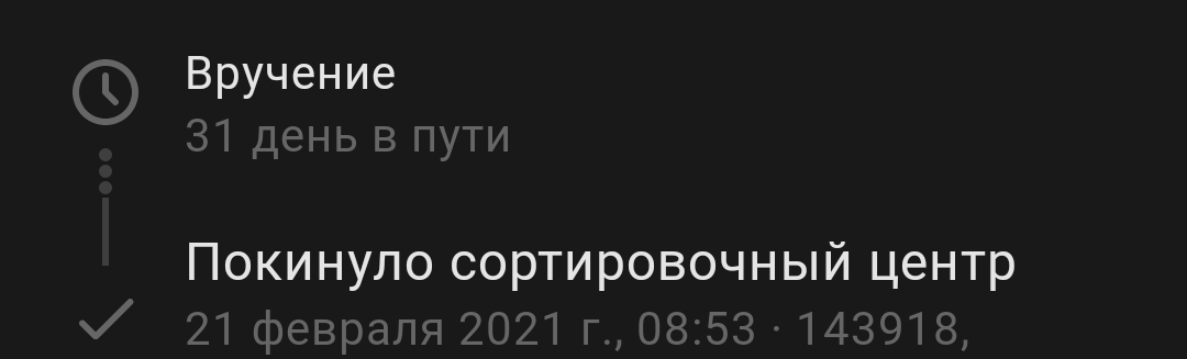 >>112486 (OP) Трек номер не обновлялся с ноября, посылка не пришла за весь срок защиты, открыл спор с пруфами того, что трек не отслеживался месяцами – спор закрыли без возврата. Подал апелляцию – отклонили и сказали, что нет пруфов. Просто пиздец, как я им должен доказать, что посылка не пришла?