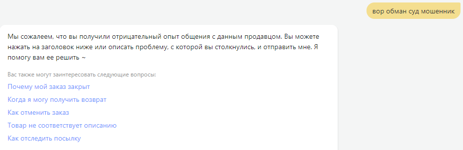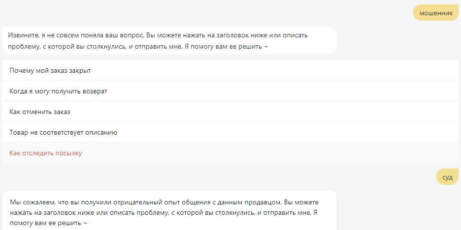 >>113985 → > Китаец дал левый трек, а спустя месяц написал что не может мне выслать Классика, про которую я рассказывал. Это тебе ещё повезло, мог молчать пол года. >>113985 → > По треку посылку вообще ы Калуге ебаной какой-то хер получил и в споре поддержка вынесла решение, что продавец прав, а мне следует спросить доставку либо кто-то из родственников получил втф Ты хочешь спорить с автоматическим ответом? Пиши ещё.