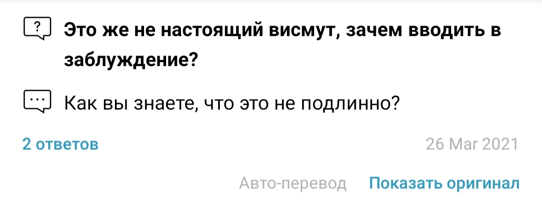 Господа, вы по-любому замечали, что под популярными товарами стали появляться всякие ебанутые вопросы или наезды на продаванов. И, в большинстве своём, они оставлены с русских аккаунтов. Кто-нибудь знает, что это за хрень? Раньше такого 100% небыло. Вот пример подобного. Я в этом магазине покупал- висмут точно оригинал.