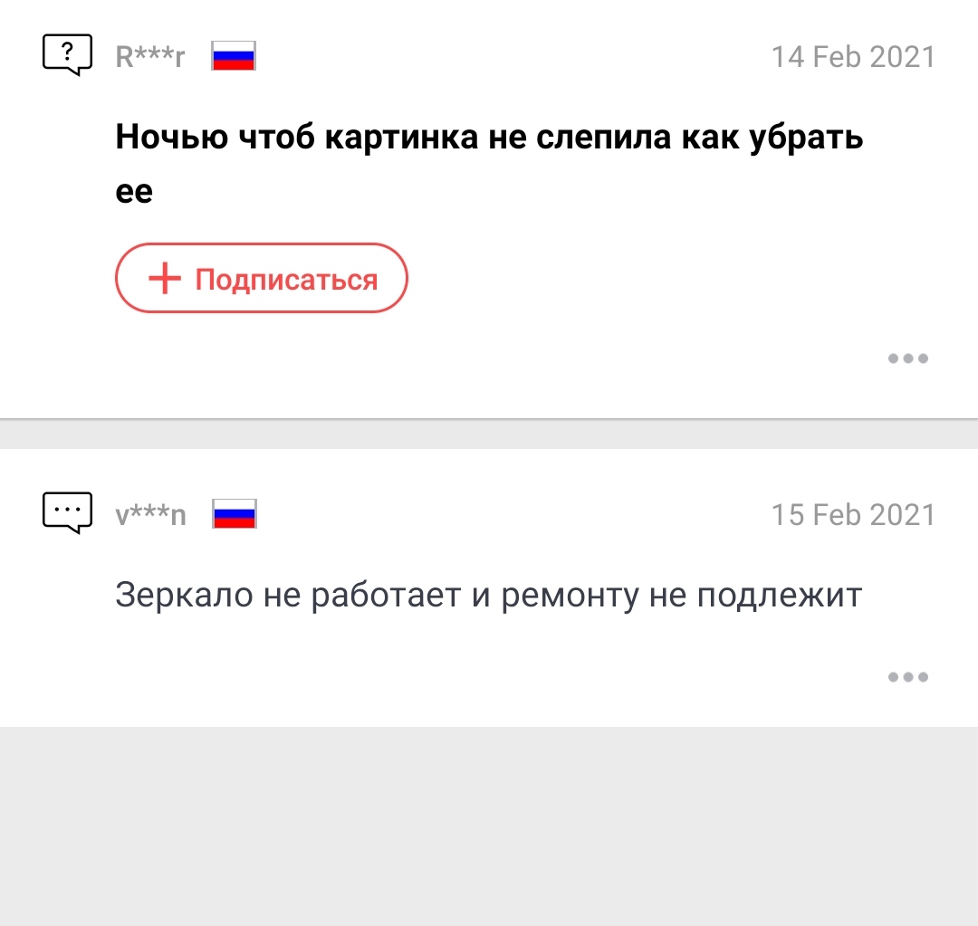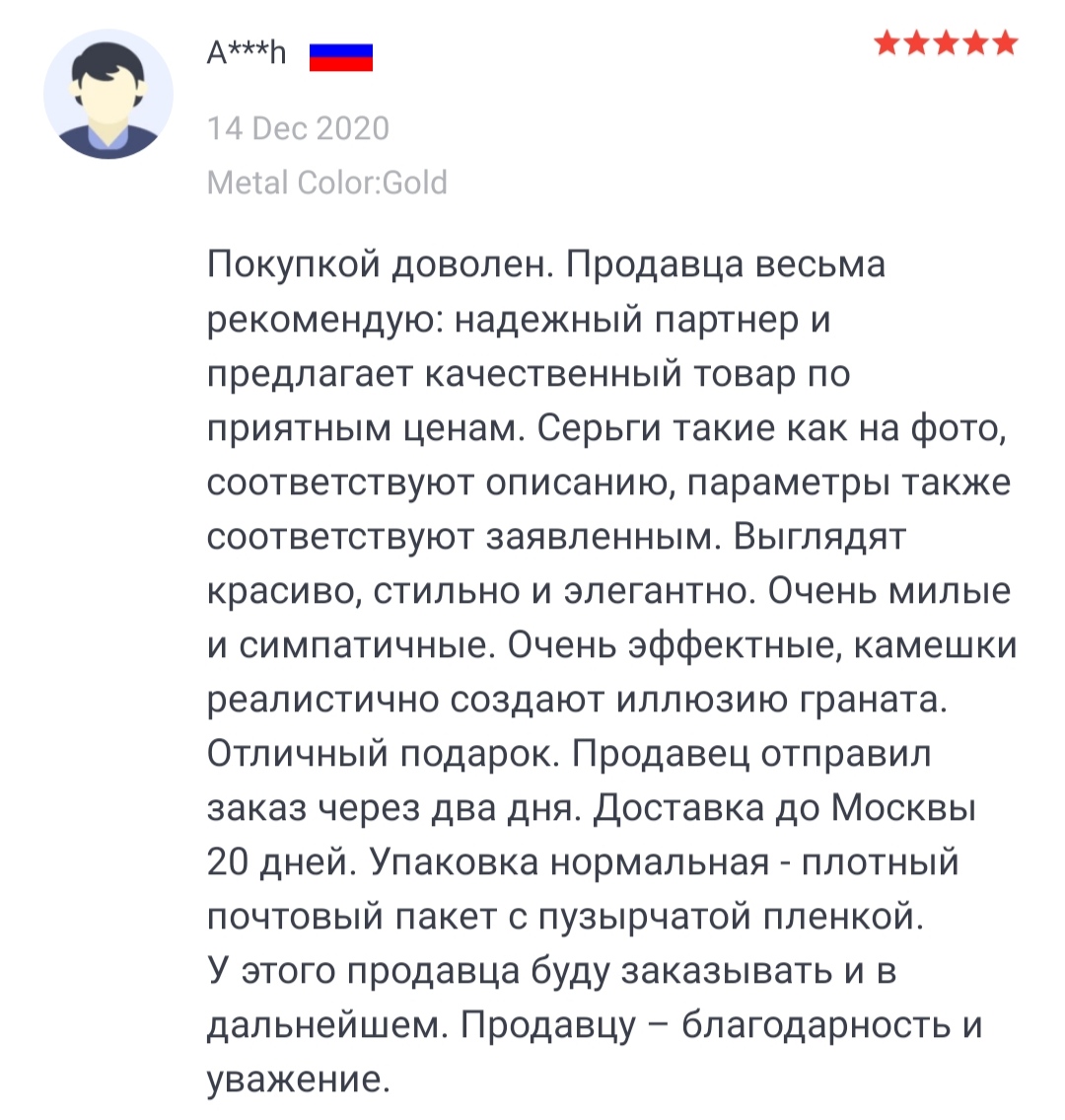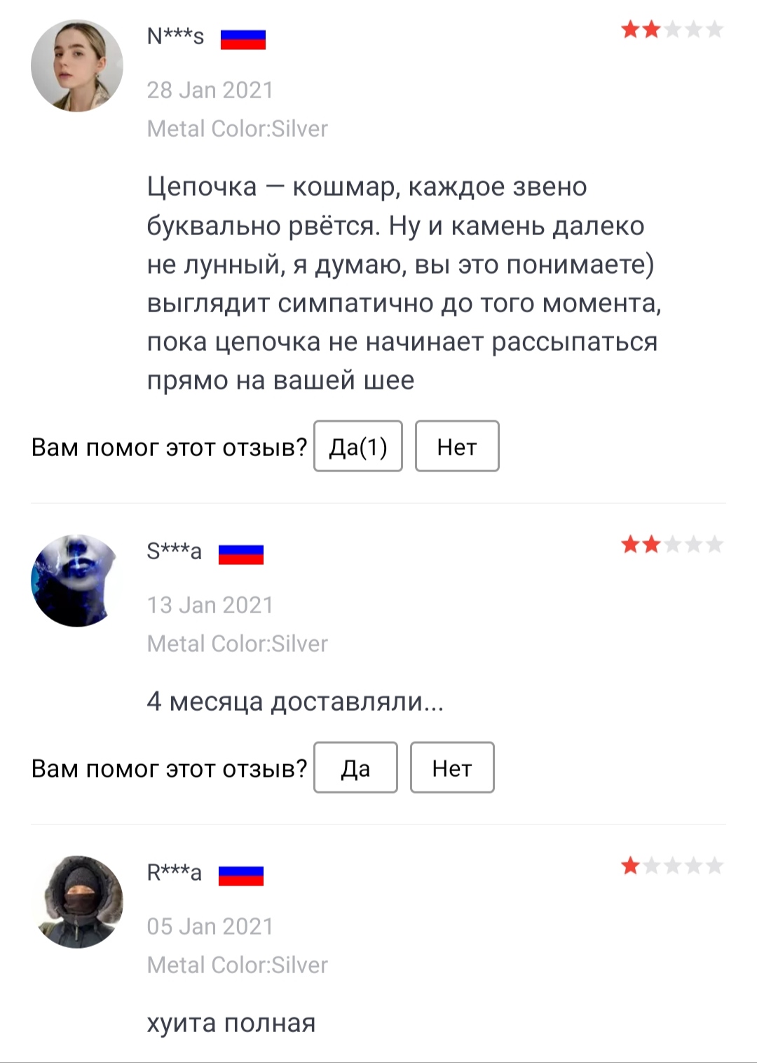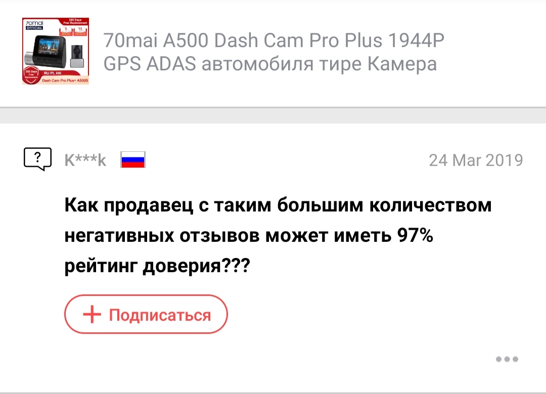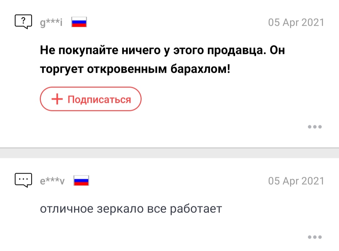 >>114151 Лям подписчиков не говорит о том, что они не могут периодически высылать брак. Это бывает. Ну и чем популярнее товар, тем больше отзывов, в том числе и негативных - выше про это уже говорил. А то что многие с русским флагом - ну так на али просто в принципе много русских покупателей, на каждом третьем товаре половина отзывов от русских. Возможно, али в зависимости от твоего положения ещё подстраивает показываемые отзывы, хотя вроде нет такого