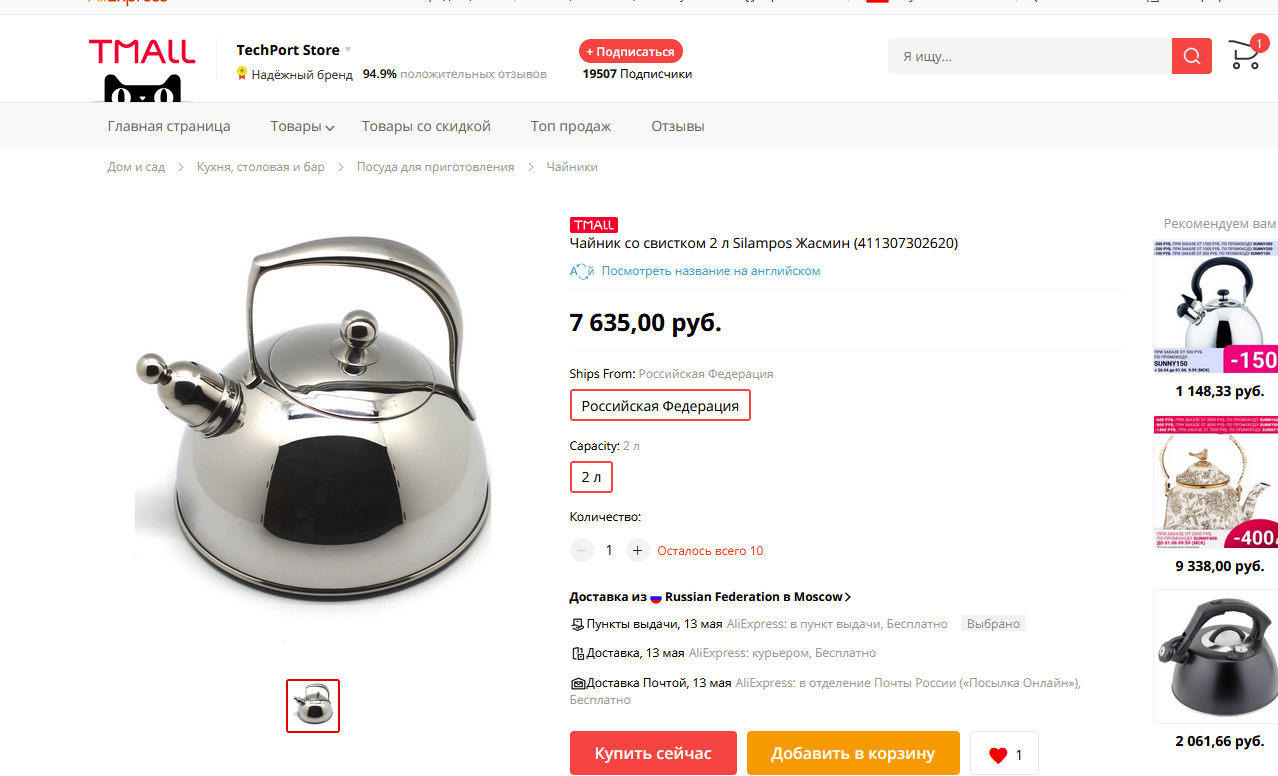 Внимательно следите за ценами в магазине Tmall. Цены там могут быть примерно такими же, как в других магазинах в России! Внимание - цены в этом магазине выставляются в рублях, поэтому при покупке в этом магазине целесообразно менять валюту на али на рубли. У этого магазина так же свои купоны в рублях, они несовместимы с обычными. Товары поставляются курьером со складов в России от российского юрлица, имеют гарантию в России и всё такое.