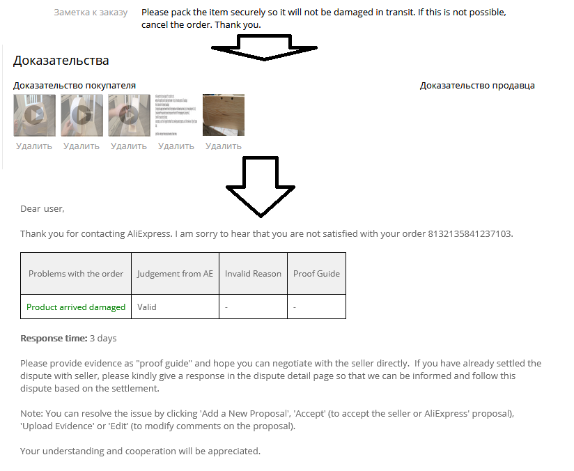 Отсюда два вопроса: 1) что от меня хочет алиэкспресс, когда пишет: Please provide evidence as "proof guide" 2) мне ждать 3 дня или сразу можно отказываться, чтобы оспаривать решение?