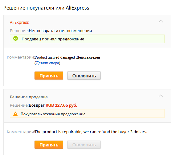 НИКОГДА не соглашайтесь на возврат денег на PayPal или другие платежные системы! Это обман! Китаец отменит платёж, как только вы закроете спор. Слушать рассказы про то, что вам отправят новый товар тоже не имеет смысла. Все операции с деньгами должны происходить через Али!