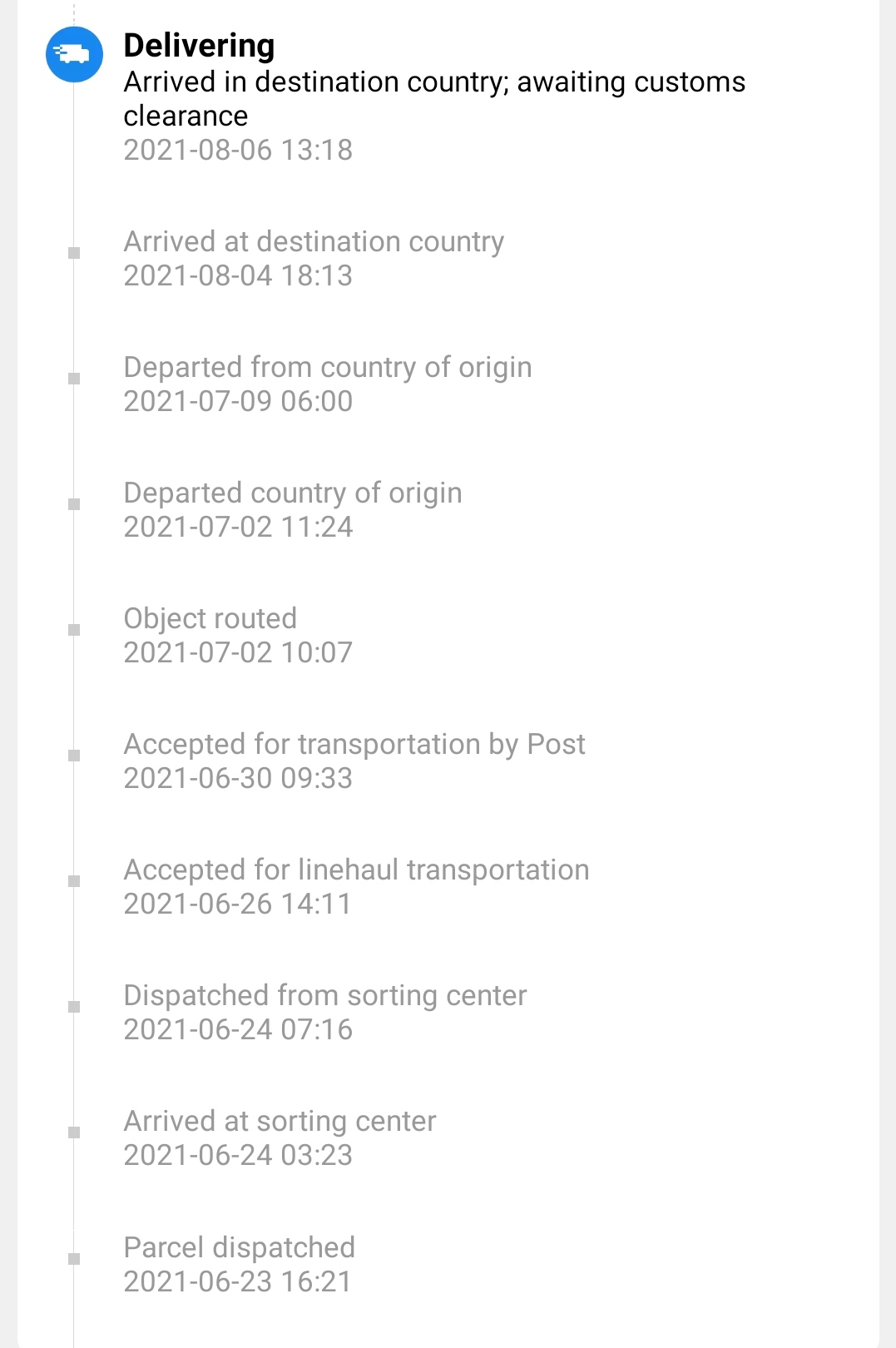 Кхм Две посылки, отправились в путь с разницей в Одна уже долетела до Казани, начав путь 25го, телефон же завис на "экспорт международной почты", начав путь 26го. Ват та фак? Как вторая посылка умудрилась зависнуть на экспорте? Самолёта не нашлось? Или он в воздухе завис?