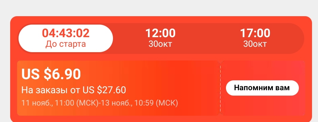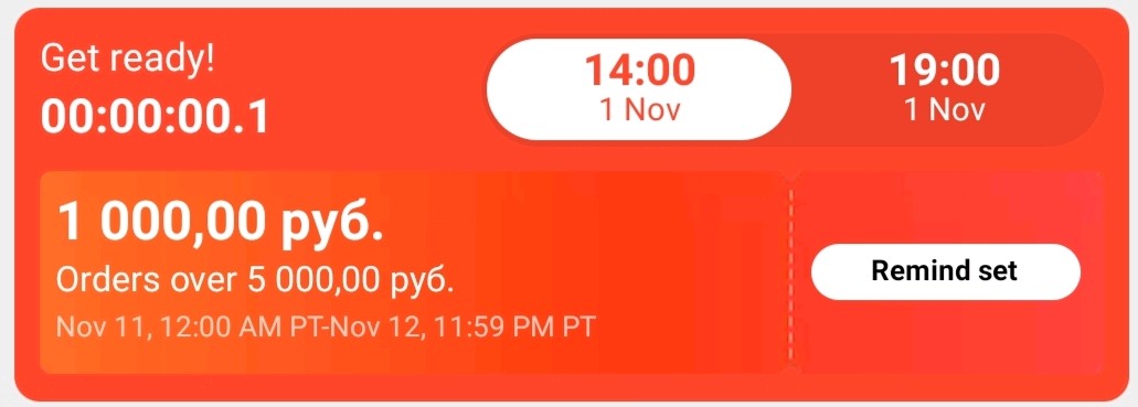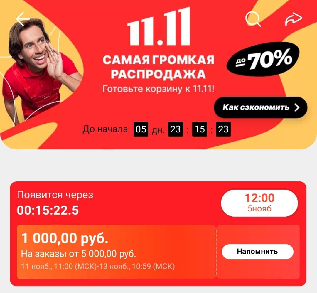 Напоминаю ,что с сегодняшнего дня будет изменен график раздачи купонов от Али, а так же добавится два номинала: С 8 - 10 ноября, 4 раза в день (по МСК) - в 09:00 купон 2000 от 10000 руб. - в 12:00 купон 1000 от 5000 руб. - в 17:00 купон 500 от 2000 руб. ⁃ в 19:00 купон 500 от 1000 руб.