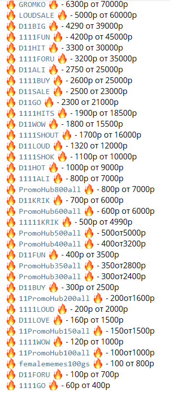 ох ребятушкииии пиздец блять иваны нахуй изголодались блять если раньше промики даже через 3-4 дня можно было юзнуть, ну 1 из 20 канеш, но можно было ТО СЕГОДНЯ ПИДАРАШКИ ЗА ПОЛ ДНЯ НАХУЙ ВСЕ ПРОМИКИ СЪЕЛИ ПОДЧИСТУЮ остались говняные типа 1111GO 1111WOW 1111LOUD ну и на десерт остаток aliprosto200all1 loudSALE11200all1