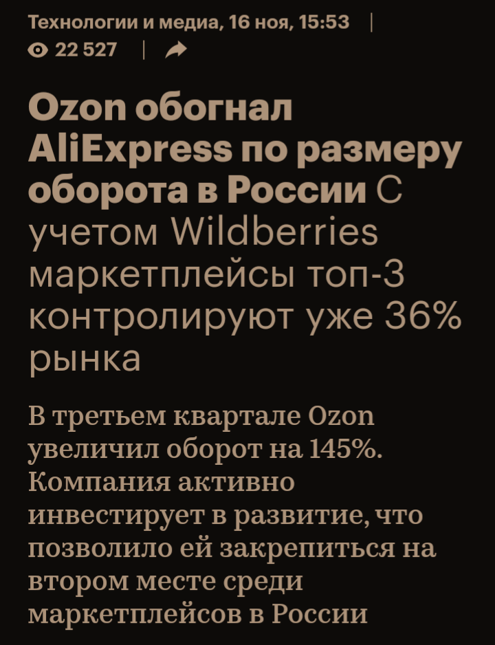 >>116801 >В третьем квартале Ozon увеличил оборот на 145% Нихуя себе, это же почти 146%, чего они там такого сделали за тот квартал, доставку еды открыли? И вообще, есть кто на озоне? Поясните итт, что там продается, в чем отличие от других маркетплейсов, доставка, есть ли жирные акции как на али, чтобы за полцены ништяки поккпать?