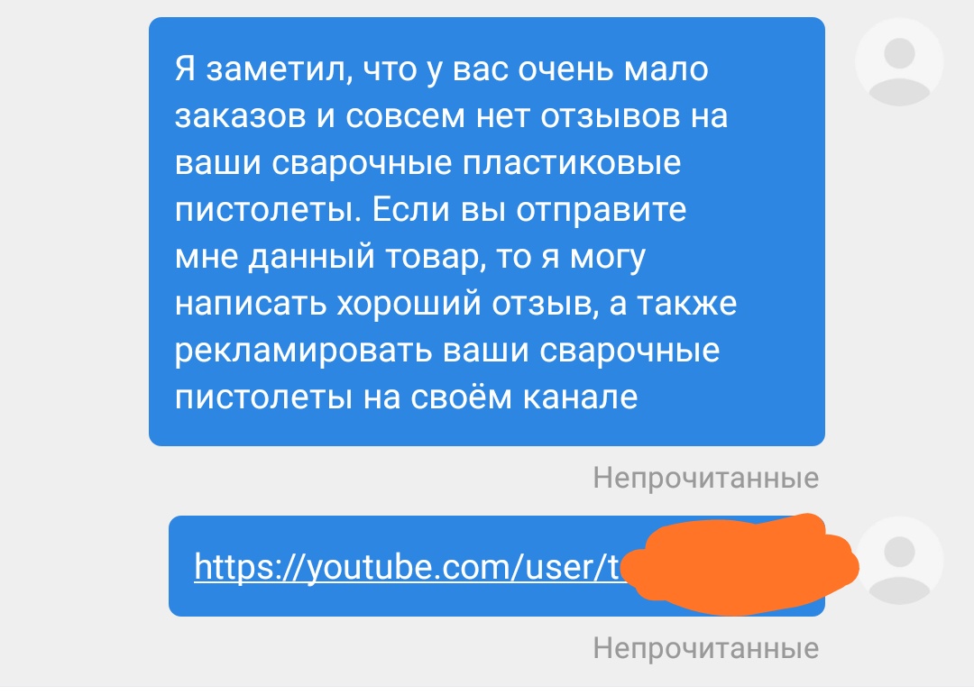 >>116998 Ну вот и закономерный итог. Продаван слился, товара теперь "нет в наличии". Написал ему, что у него мало заказов и нет отзывов на эти фены, а я типа ютубер, оставлю отзыв и прорекламирую товар, если он отправит мне его с такой скидкой. Говорят, что китайцы наивные, посмотрим, так ли это. Канал, конечно, не мой, но там 1к пописоты и обзоры всякой строительной хуйни с алика