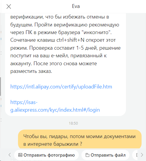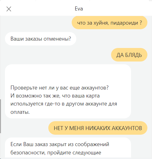 Пипец, сегодня хотел еще раз заказать отмененные вчера товары, и опять ебаная СБ алика отменили все мои заказы. Поддержка говорит типа им не сообщают и нихуя сделать нельзя. Это че, меня на алике забанили? За що???