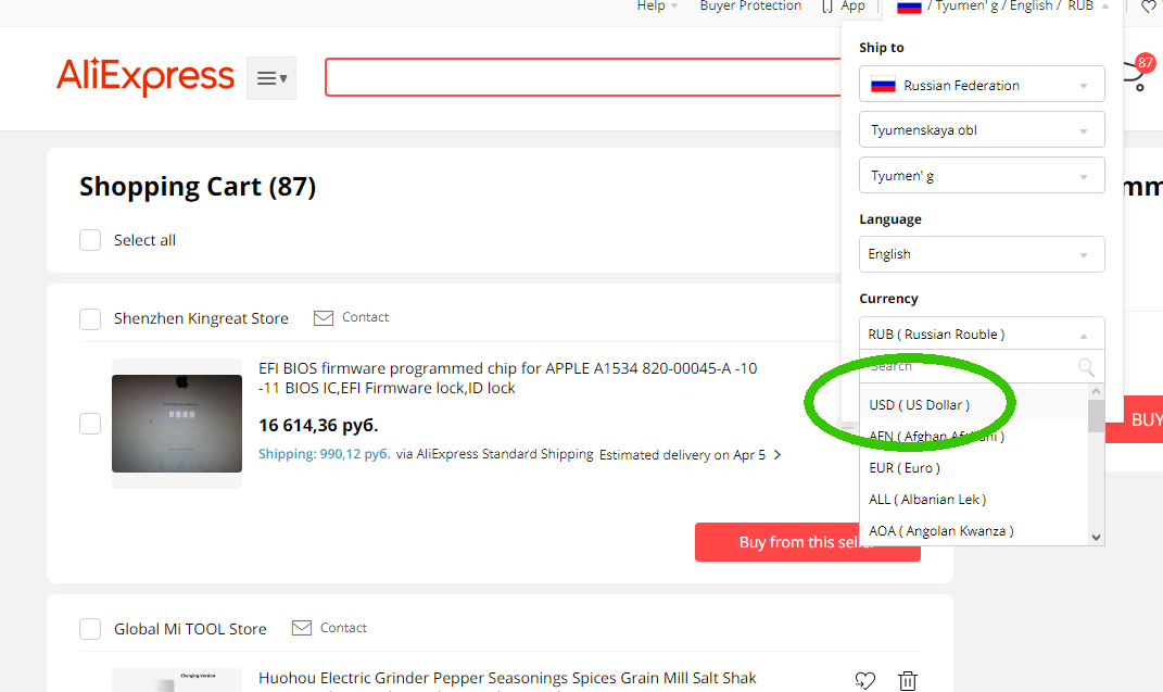Выставляйте цену товаров В ДОЛЛАРАХ для всех магазинов, кроме Tmall. Это позволит сэкономить немного на конвертации валют, ибо даже у Сбербанка курс обмена лучше, чем у Али. У них курс бывает ещё хуже, чем у Али. В любом случае, проверяйте курсы! Узнать курс Али никак нельзя, к сожалению. Он его нигде не пишет. Действует только метод пересчёта по какому-то товару (меняете валюту платежа и смотрите разницу). Внимательно смотрите на курс! Особенно, когда он едет. Тогда может сложиться ситуация, что у банков большой спред, а курс Али выгоден. Внимание, у многих онлайн кошельков при оплате Али не только свой курс, но и комиссия! Анон рекомендует использовать валютный долларовый счёт в любом банке для оплаты покупок. Относительно льготные условия таких карт у Райффайзен банка, Тинькофф банка, банка Открытие, ВТБ.