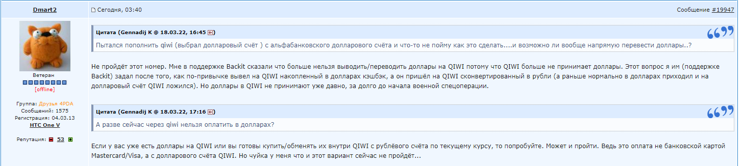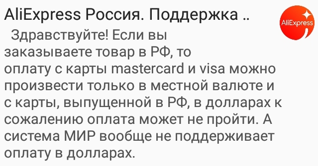 Вчера попытался купить что то с али Обосрался по полной Сам дебил Я зачем то накупил доллары и не загуглил Карту тенькофф мир не принимает Мне посоветовали через киви Я снова нихуя не прочитал заранее и стал кидать туда доллары Эти пидоры переконвентировали их в рубли и купили уже у себя Итог 15 долларов проеба И теперь у меня вопрос, а на Али так же будет? Они снова продадут мои доллары и купят на них доллары у Али по своему курсу? Последнее особенно важно Так как пидоры из киви вообще не отвечают ни на звонки ни в чате В отличие от Тенькова