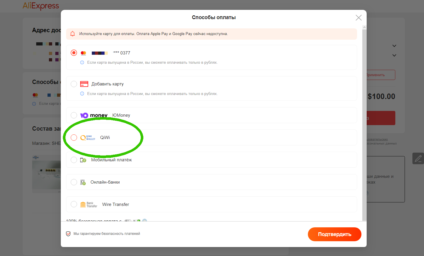 Прошла инфа, что типа на Али починили оплату картами, и типа все карты должны работать. При этом у многих пропала возможность оплачивать с киви.