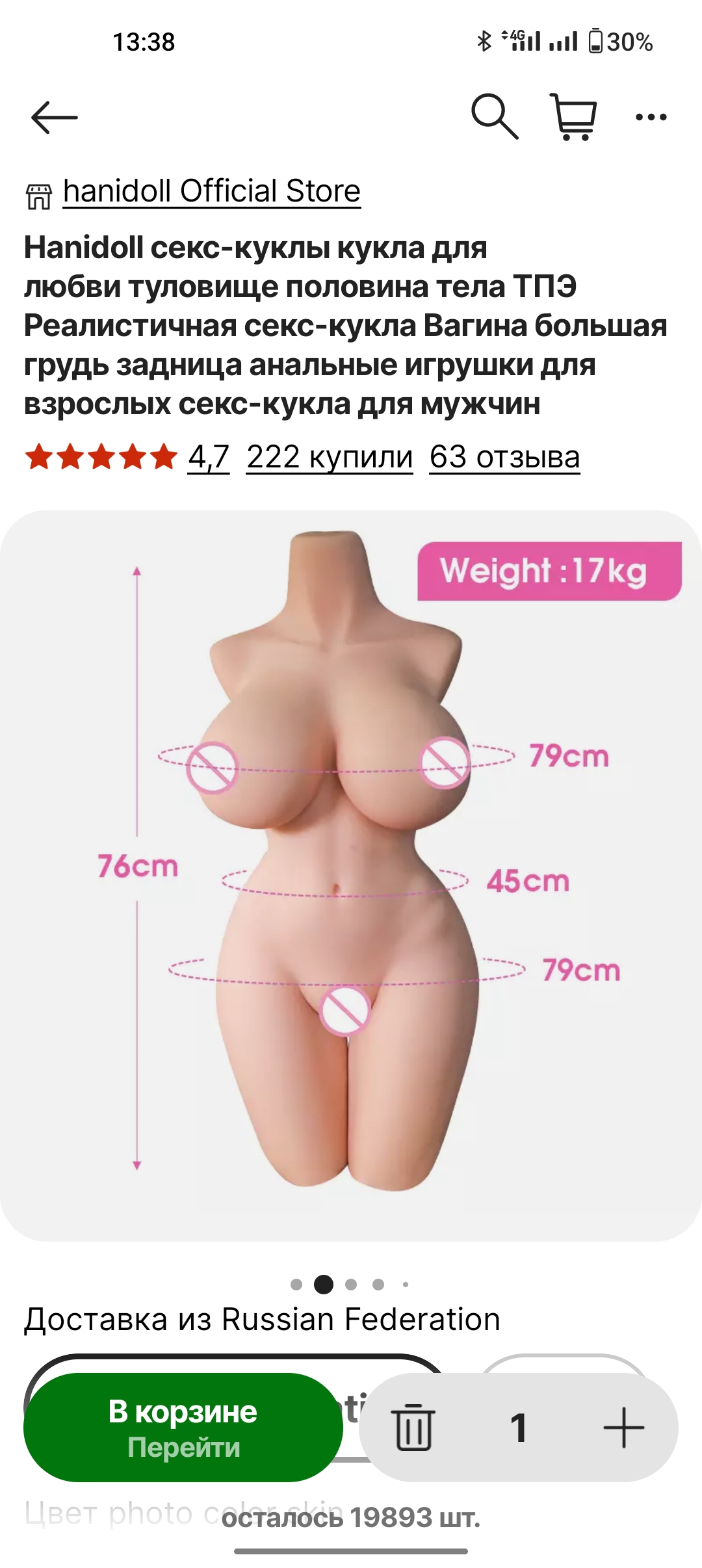 так аноны сегодня пришла моя Лол от айрон тех!Привезли на дом. Все глухо запаковано - на самой картонке ничего кроме надписей хрупкое и тд. и замотано в желтый скотч. Курьер ахуел когда вытаскивал - вес с упаковкой 57кг! На вопрос что это сказал ему что тумбочку с Али заказал. Внутри кукла в чехле с надписью Irontech. Таскать и одевать тяжело! Функция специальных ног не работает - жопень и сиськи перевешивают! В комплекте палочка для нагрева отверстий дешевая одежда парик(жутко липнет к самой кукле) руководство пользователя и все! Гандоны и смазку не положили(щас пойду в ближайший сексшоп). Вживую выглядит оч приятно и естесственно! Жопень вообще мое почтение. Фото приложу позже ну и отзывы как она в плане сэкса тоже будут позже!