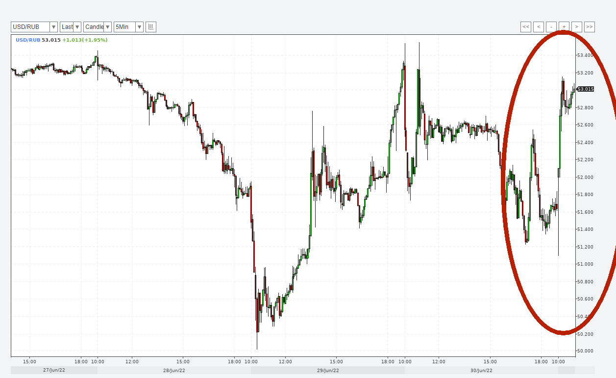 Во вторник пара USD/RUB показала резкий рост, поднявшись до отметки 62 руб./$1, ослабление рубля за день достигало 12%. Движение курса рубля в последние три дня очень напоминает рост пары USD/RUB в период с 25 по 27 мая. Тогда рубль резко ослаб без видимых причин и на рынке ходили разговоры о неофициальных интервенциях, о чем даже писали “Ведомости”.