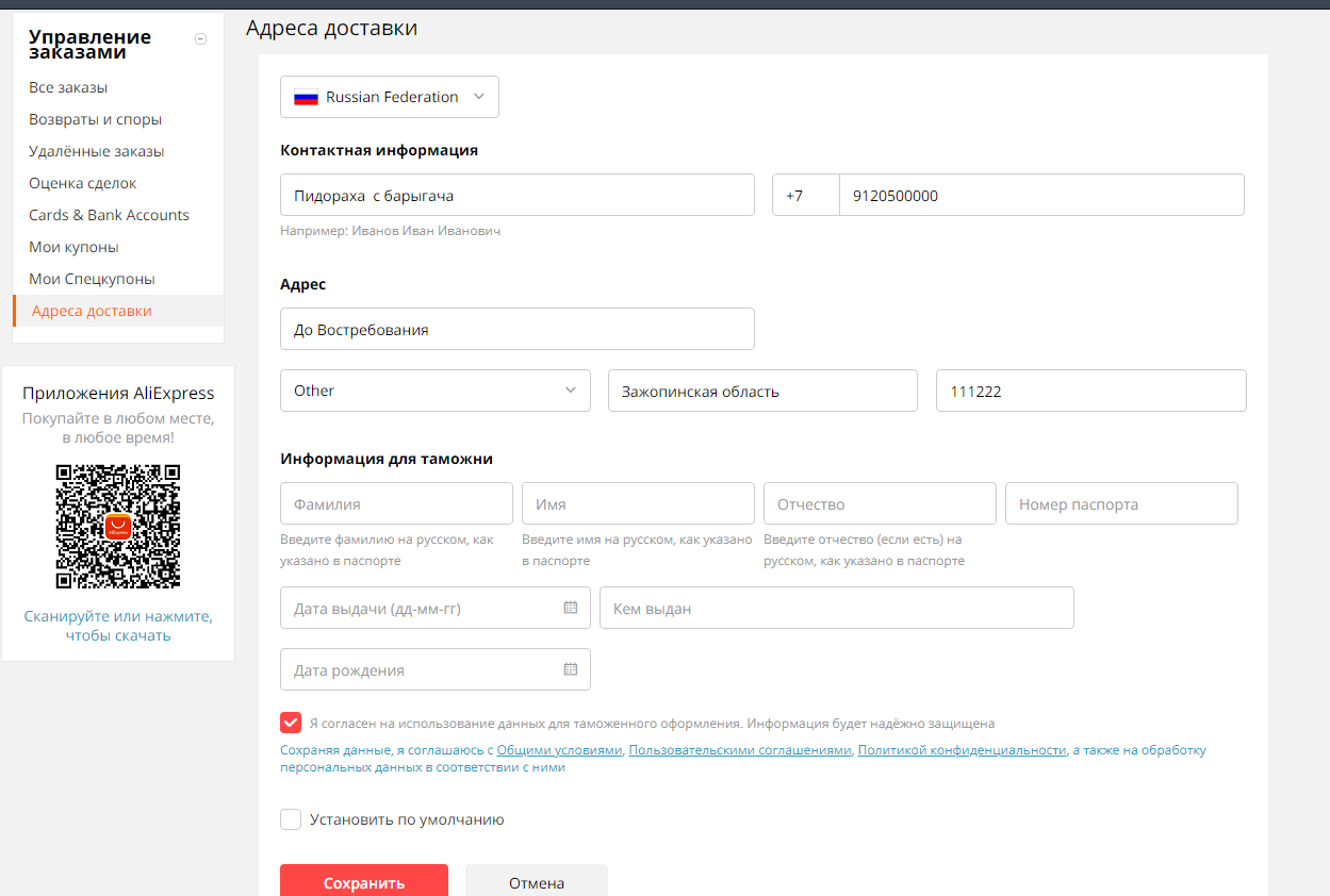 >>120758 Отправляю до востребования в соседнее отделение уже несколько лет, но дефолтным в профиле стоит домашний адрес, если это важно. Т.к. в последнее время али (пока было можно, еще международный) кладет хуй на указанный адрес и сам без спроса "апгрейдит" доставку до самовывоза, когда ему хочется. Пункт самовывоза выбирается хуй знает как, но пока это всегда несколько ближайших, в которые я и вручную когда-то пробовал заказывать, т.е. может выбирает из истории. Причем наоборот тоже бывало, когда вместо выбранного мной самовывоза али привозит на обычную почту по дефолтному адресу.