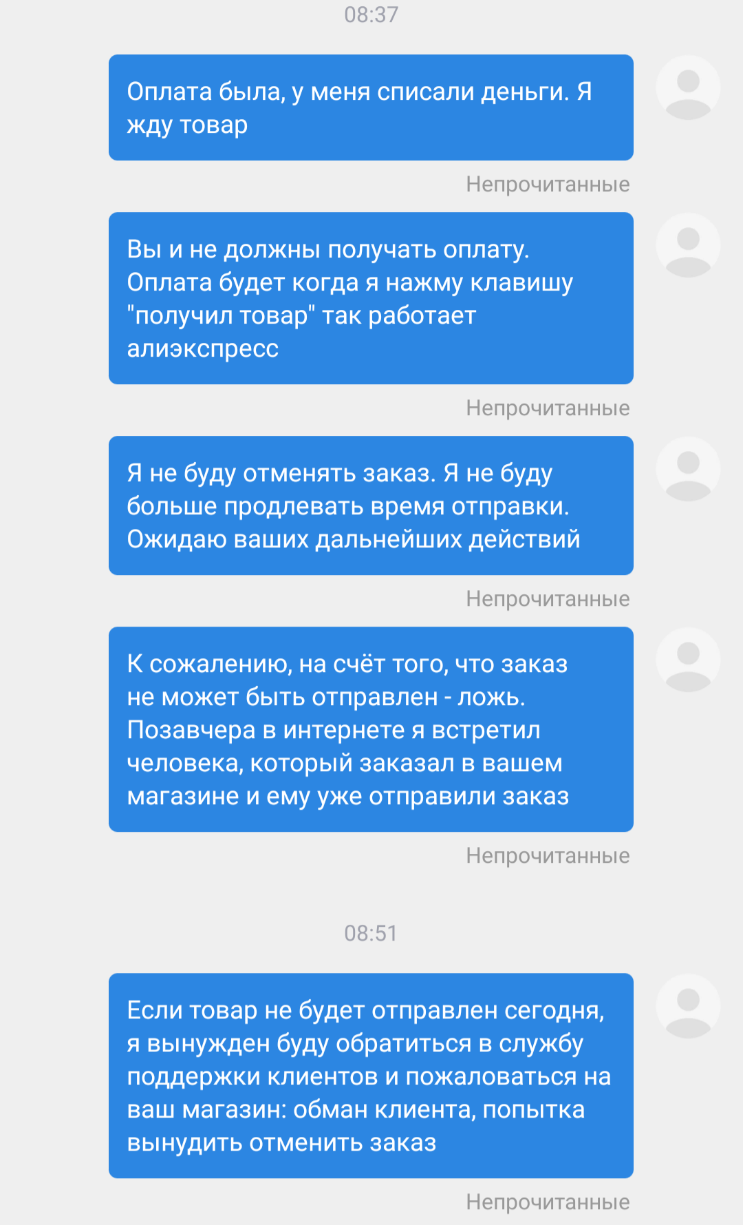 Барыга сегодня утром высрал вот эту простыню. Я конечно написал в ответ все вот это вот, но, походу, уже зря. Окуклился продавец. Походу, серьёзные проблемы у него. Или с логистикой или товара нет Буду ждать отмены заказа. Если не отменять вручную, а ждать пока отменится само, барыге приходит штраф за неотправку.