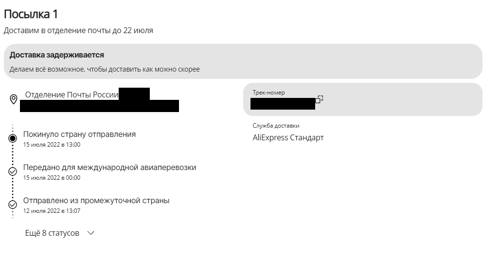 НЕ СТОИТ ПИСАТЬ ПРО ТО, ЧТО ВАША ПОСЫЛКА ЦЕЛЫХ 3 ДНЯ ЛЕЖИТ В ШАРАПОВО. Это совершенно нормально. Не стоит пороть горячку, если посылка идёт МЕНЕЕ ДВУХ МЕСЯЦЕВ. Не бойся простить продлить срок доставки. Если продавец игнорит и он вышел - открывай спор. Ali не даст открыть выиграть вам спор по не дошедшей посылке, если с момента её отправки прошло менее ~60 суток, и трек посылки хотя бы раз обновился за последние 2-3 недели. Открывать спор до конца срока доставки таймер не целесообразно. Причина спора - посылка ещё в пути, бла бла бла. Не злоупотребляйте спорами, могут забанить аккаунт и имя/адрес доставки/карту. АлиЭкспресс часто заставляет вернуть товар, если вы не довольны его качеством. С недавних пор почта России любит объединять множество посылок в одну и привозить тебе сразу мешок дилдаков. При этом происходит выдача нового трек номера от посты России. Это можно увидеть в приложении почты. ПРИЛОЖЕНИЕ ПОЧТЫ РОССИИ ГОДНОЕ, им можно и нужно пользоваться, в том числе для выдачи посылок без заполнения бумажек. Если у вас есть электронная подпись и указан номер телефона, то через приложение почты можно оплатить пошлину.