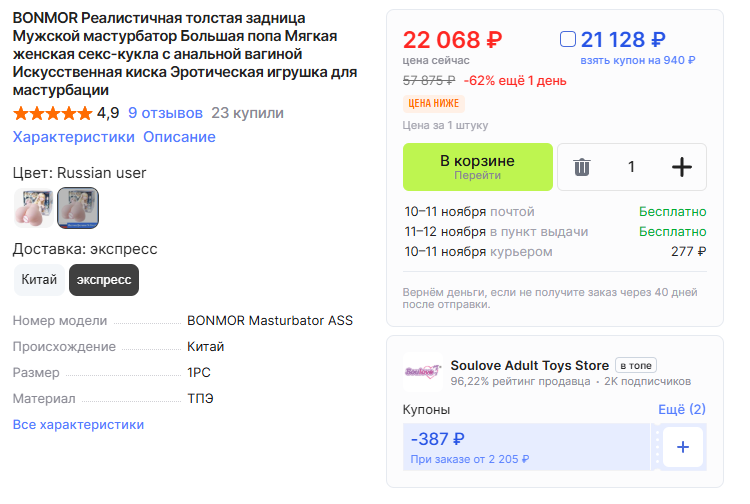BONMOR же практически всегда есть с доставкой из российского склада. Вообще сейчас в ценовом диапазоне "максимум и меньше" кроме жрицы и вампира от этих самых bonmor брать нечего. Вообще. Разве что.. Разве что ВОТ - https://aliexpress.ru/item/1005004124401673.html НО, у этого продавца нету доставки из склада в России. А так то 8к с небольшим за 11кг жопищу - это топ за свои деньги. Хочу вот таки задушить жабу и купить 15 кг вариант. Это ж прямо ЦАРЬ-ЖОПА будет. Стоять будет монолитно. И трусы на неё всякие будут подходить. Или все же торс чуть дороже есть. https://aliexpress.ru/item/1005002527324906.html Вообще, у этого продавца торсов дофига всяких - видимо они от разных вариантов кукол просто. Размеры разнятся на 4-5 см. Но блин, 24 кг как-то слишком тощим смотрится по пропорциям. 17 кг - 77 см охват бедер.. Не мало ли. Видел варианты с 82 см - выглядит посочнее. Надо померить вампирскую жепу, чтобы примерно понимать что будет. Вообще ХЗ на что рассчитывает продавец "большой жрицы" с 9 кг жопой за 20-25к. Красивая коробка столько не стоит.