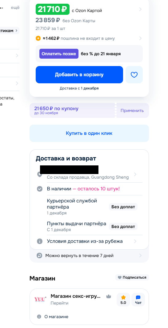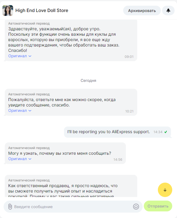 >>134783 (OP) Ну вот я заказал не ангельскую жопу, но пизду за 3к в магазине YUU на яндекс.маркете. Была указана доставка со склада РФ , 29 октября якобы придёт. А продавец потом пишет "Товара временно нет не складе, сосите хуй". При этом заказ не отменился. Значит с китая наверное собирались отправить или чё? При этом кнопки отмены уже не было, но хорошо что через поддержку удалось отменить. С жопой наверное такая же хуйня может быть