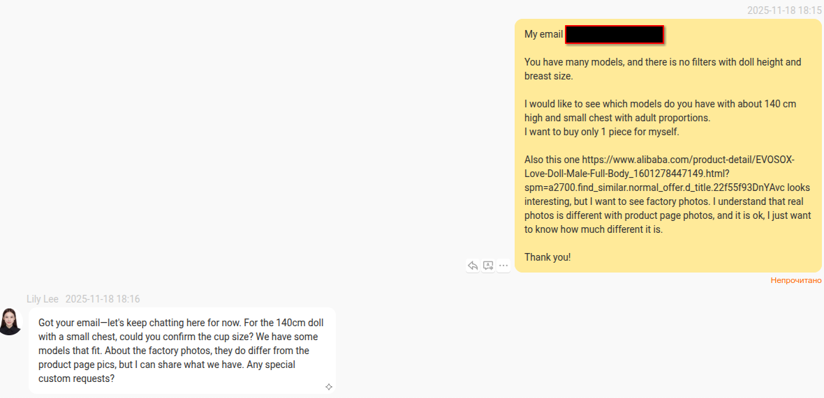 Китайские друзья перестали отвечать. У них глубокая ночь. Странно что пока у них день был они молчали, только вечером начали отписываться. Надеюсь таки скинут мне заводские фото/видео на эту куклу и она будет хотя бы на 80% похожа. На отфотошопленных фото пиздец няшно выглядит. Но я так и не нашел кто оригинальный производитель этой модели.