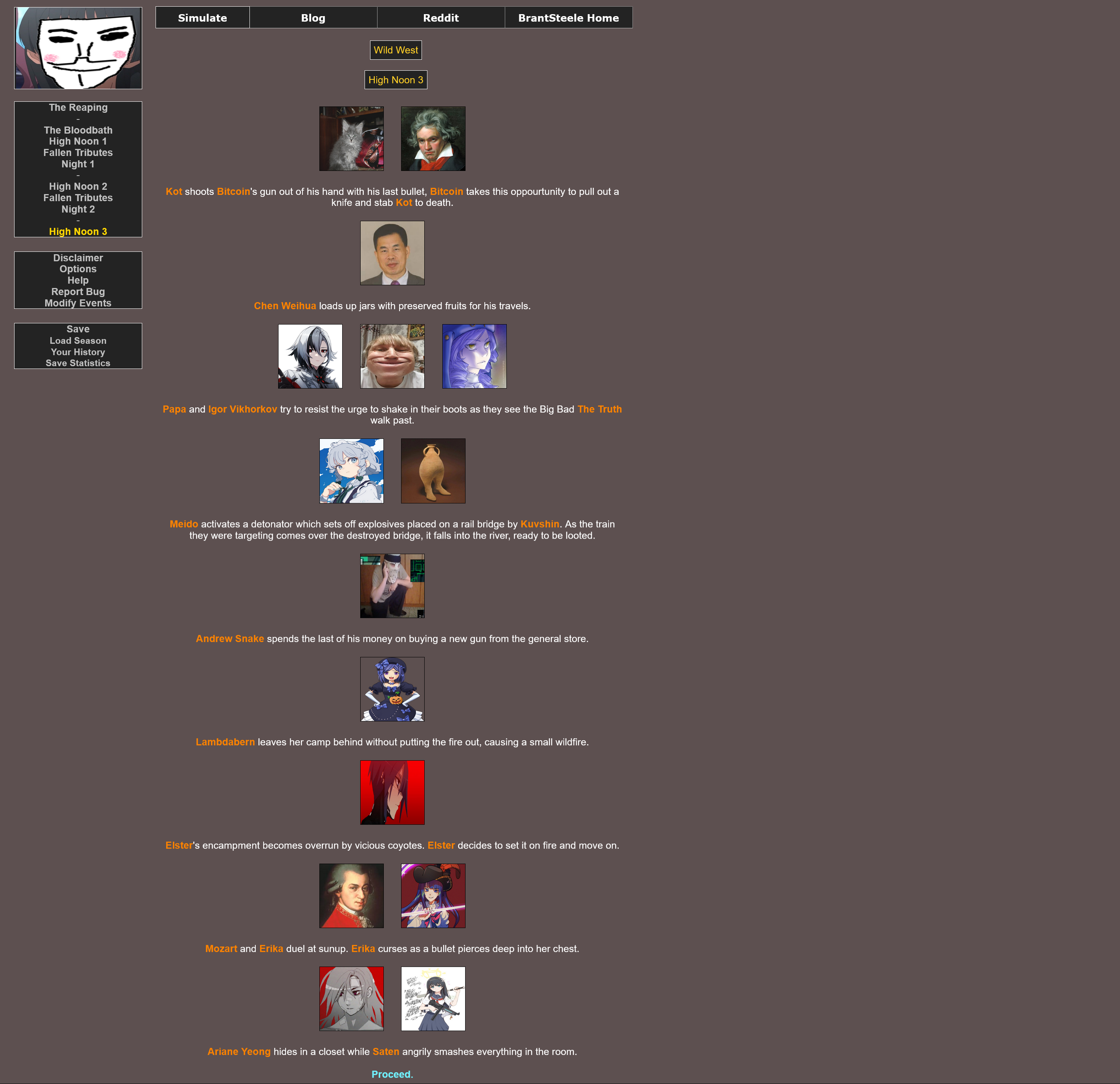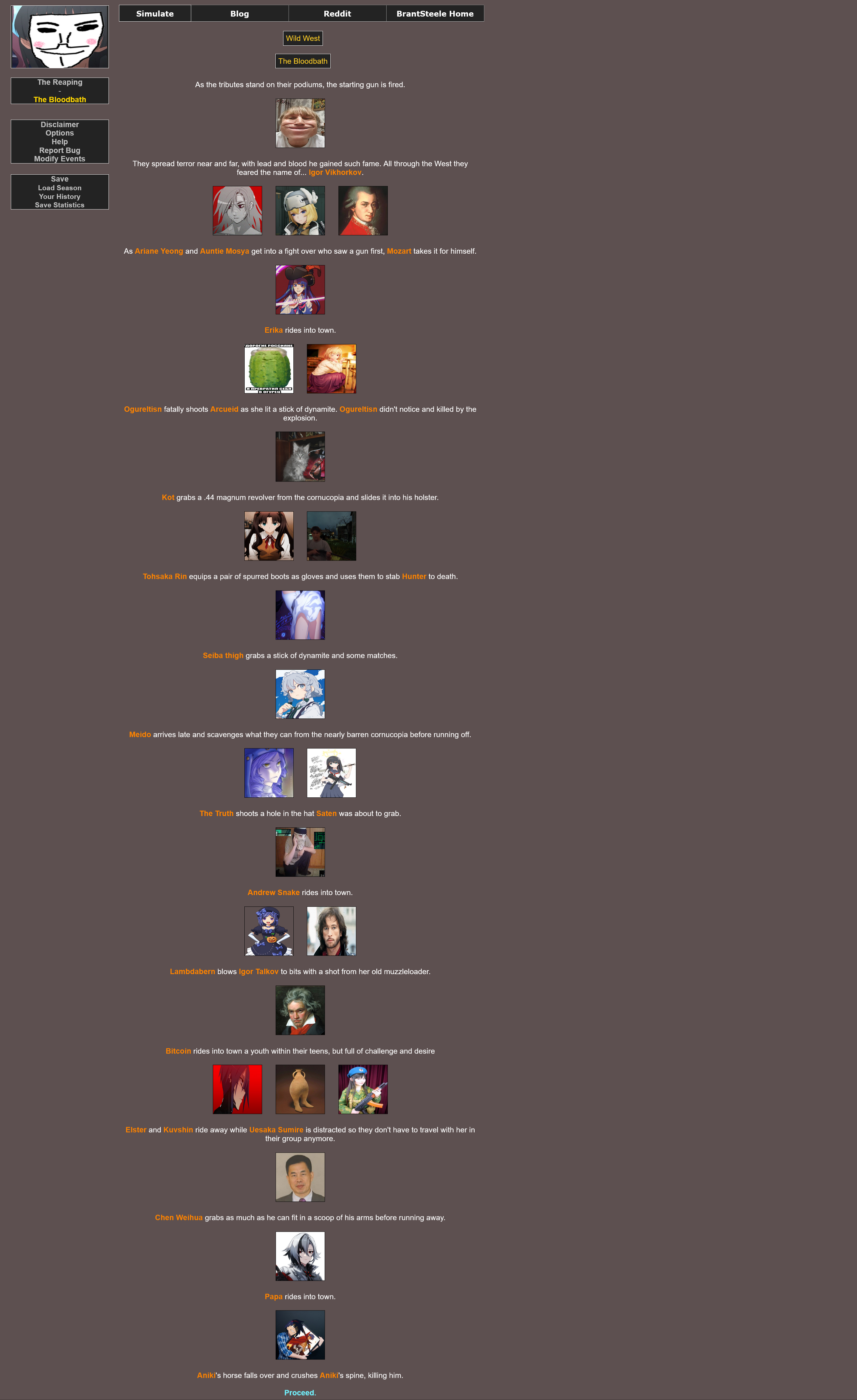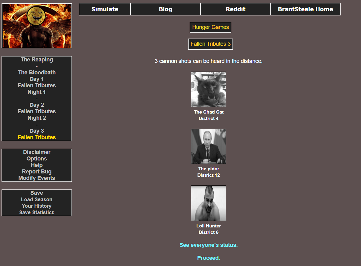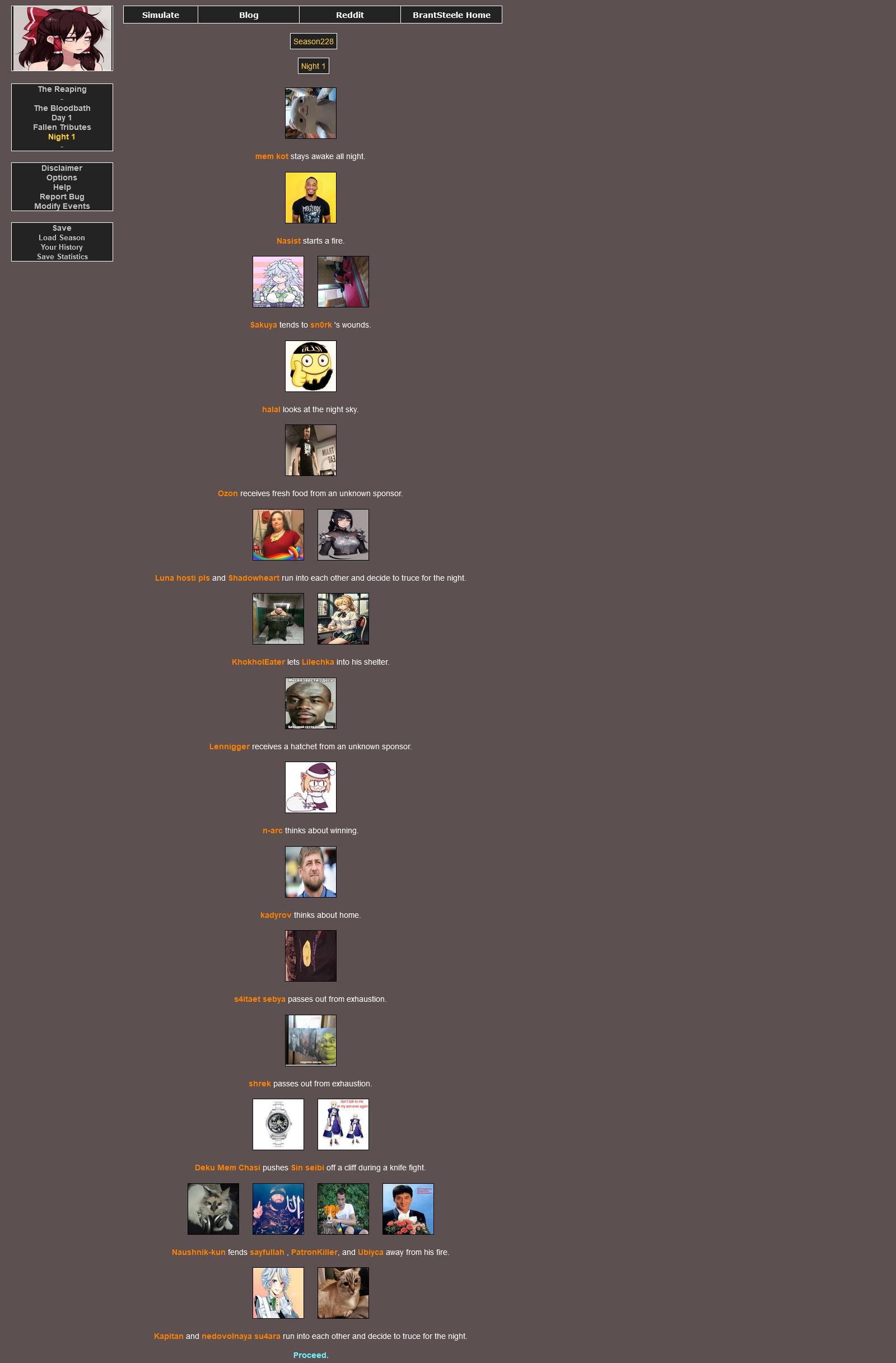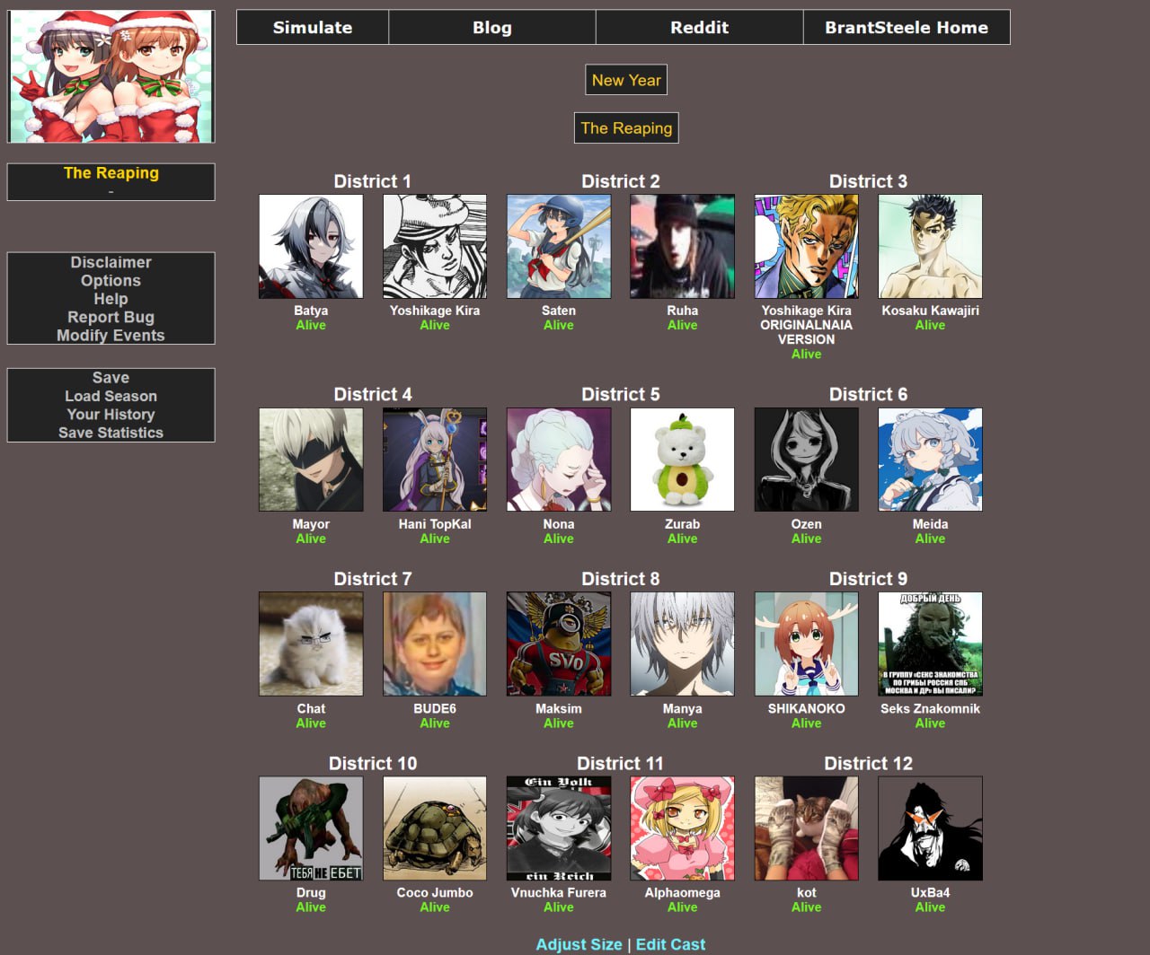 >>1536877 1. Ждёшь, когда хост даст команду на сбор персонажей. Например, как тут >>1536786 2. Вкидываешь в тред имя персонажа + его аватарку, как тут >>1536792 3. Запасаешься попкорном, ждёшь, когда наберётся 24 персонажа на игру в текущих полудохлых реалиях придётся ждать не один день. Затем наблюдаешь за тем, как твой персонаж пробивается к первенству в симуляции Голодных Игр. Ну или скорее получает перо в бочину на первый-второй день. 4. ??? 5. PROFIT!