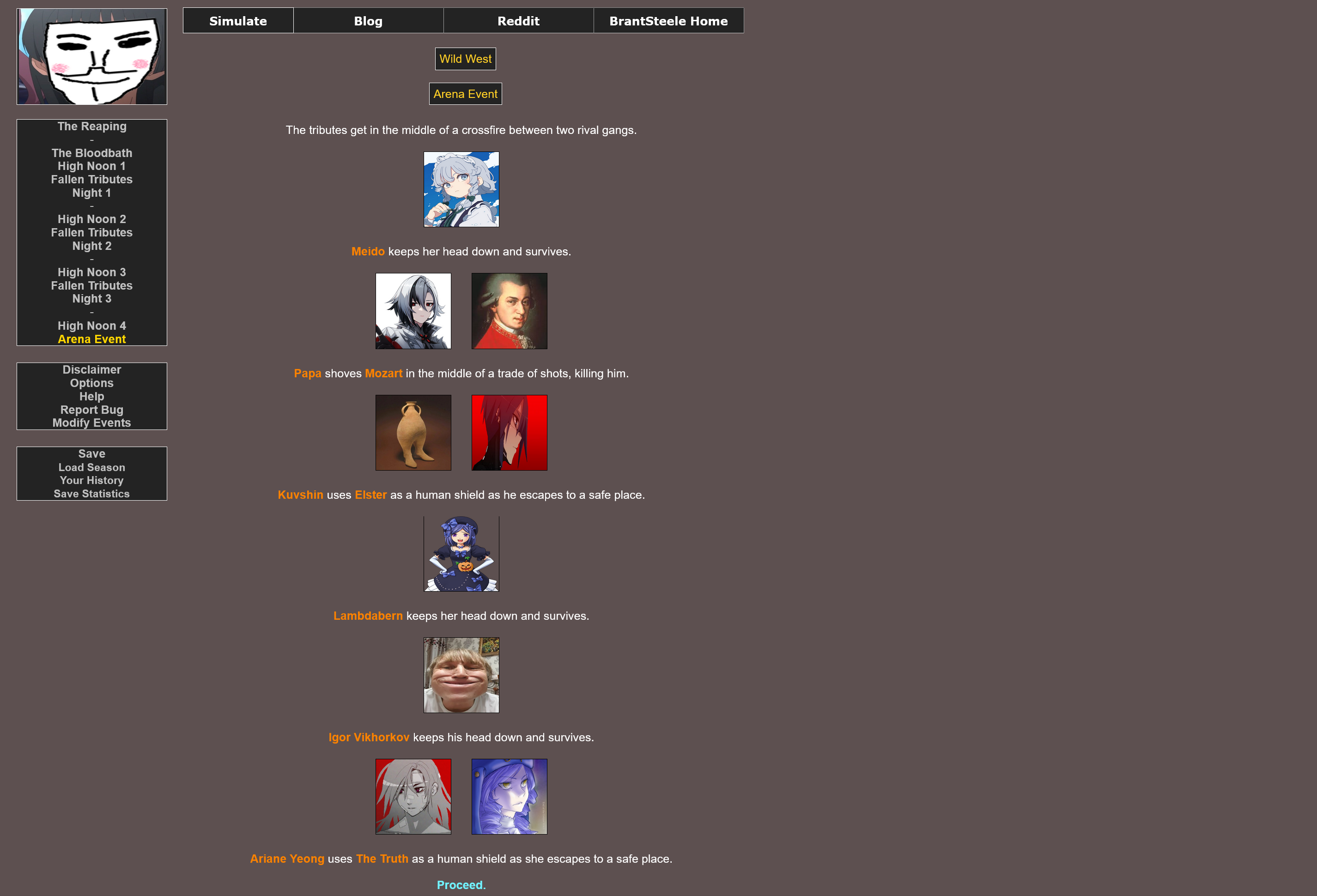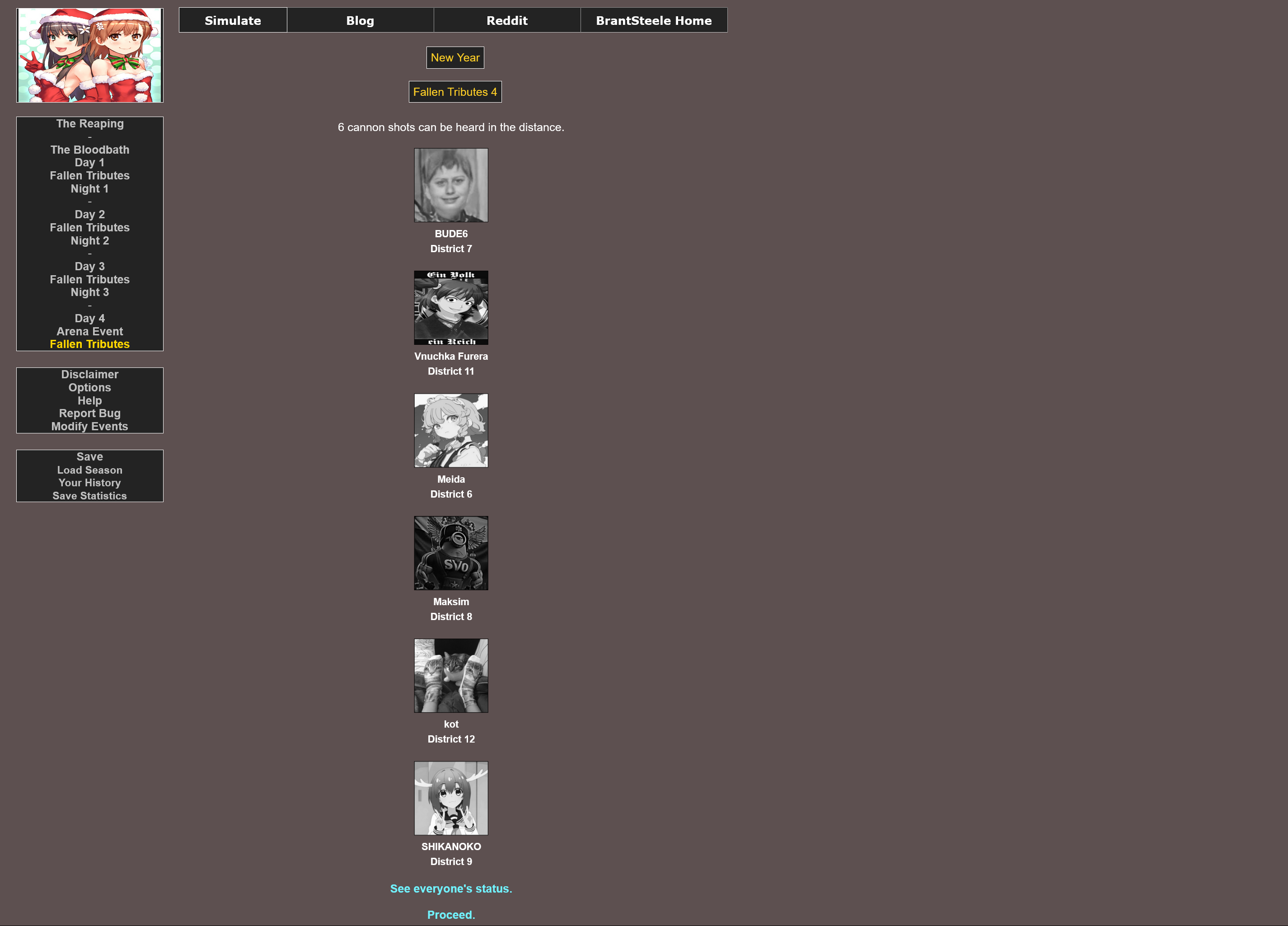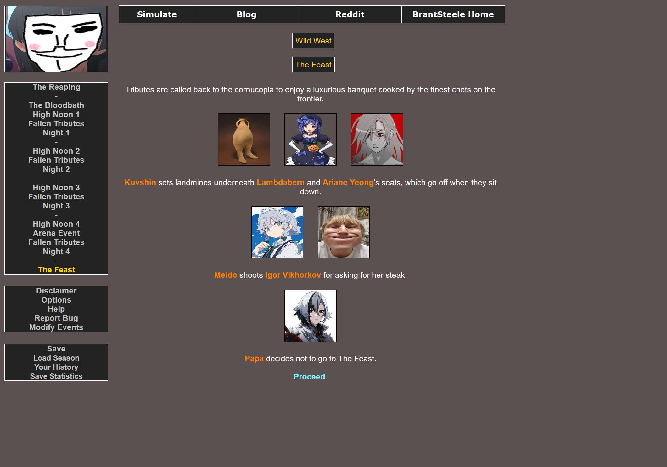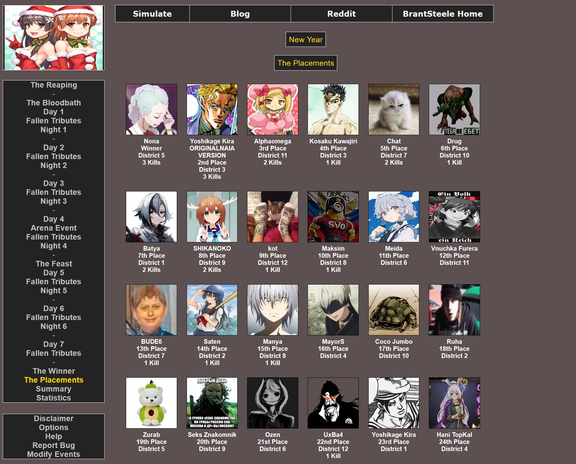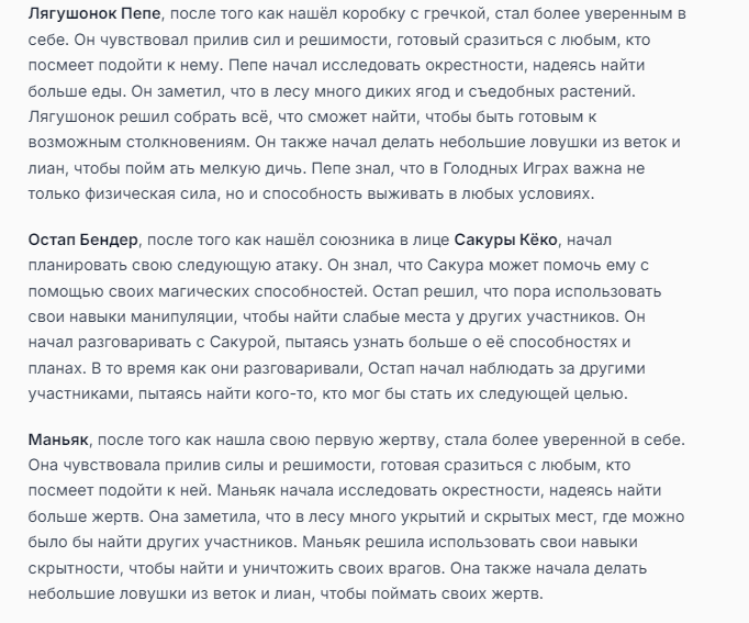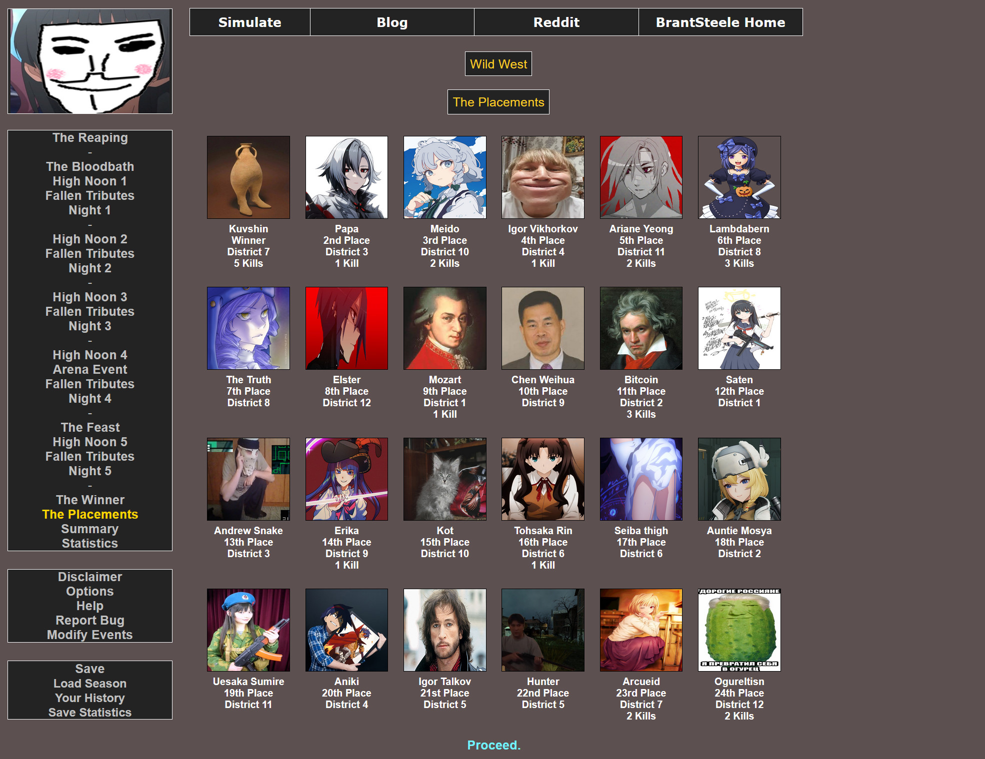 >>1536877 1. Ждёшь, когда хост даст команду на сбор персонажей. Например, как тут >>1536786 2. Вкидываешь в тред имя персонажа + его аватарку, как тут >>1536792 3. Запасаешься попкорном, ждёшь, когда наберётся 24 персонажа на игру в текущих полудохлых реалиях придётся ждать не один день. Затем наблюдаешь за тем, как твой персонаж пробивается к первенству в симуляции Голодных Игр. Ну или скорее получает перо в бочину на первый-второй день. 4. ??? 5. PROFIT!