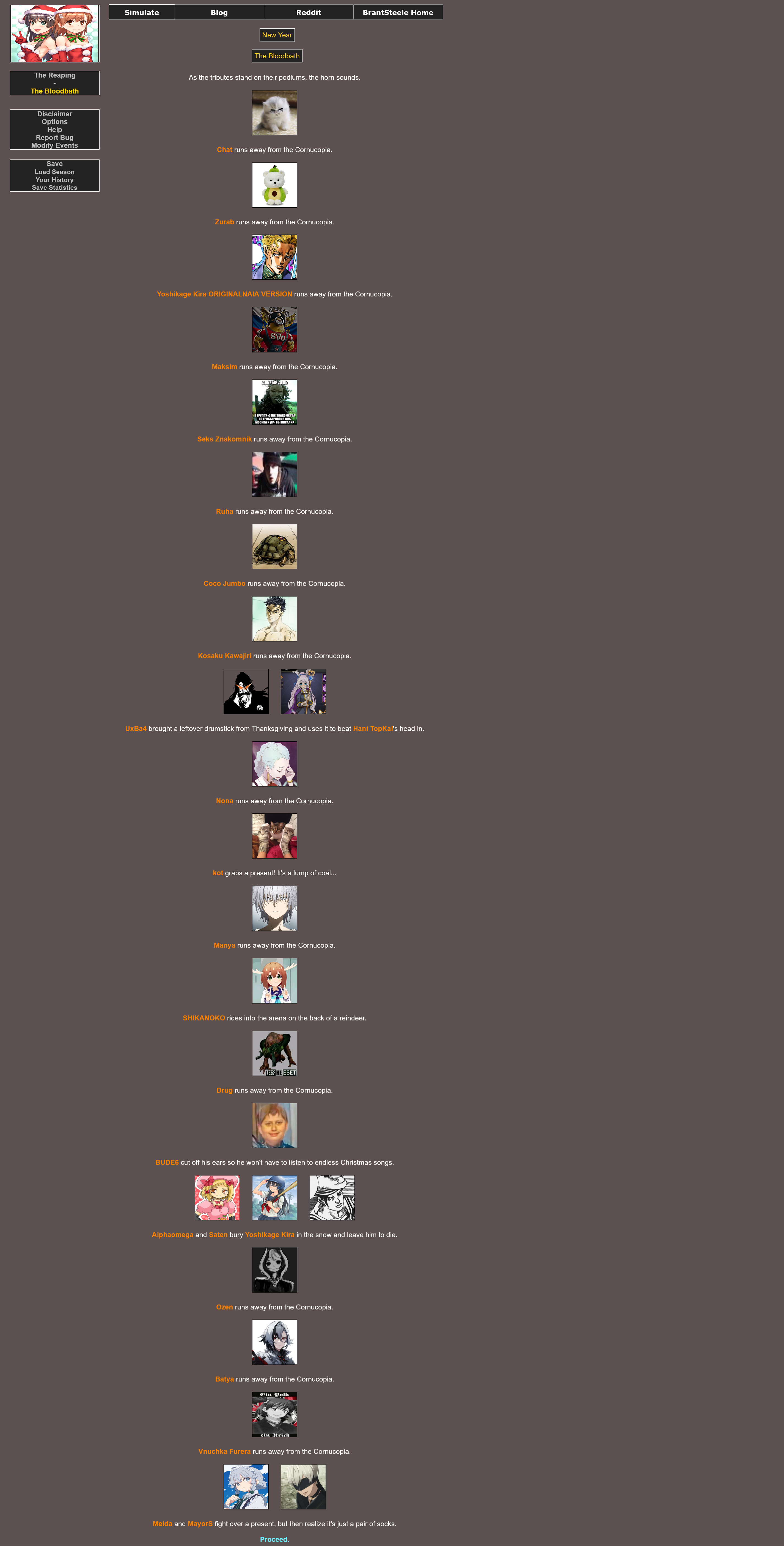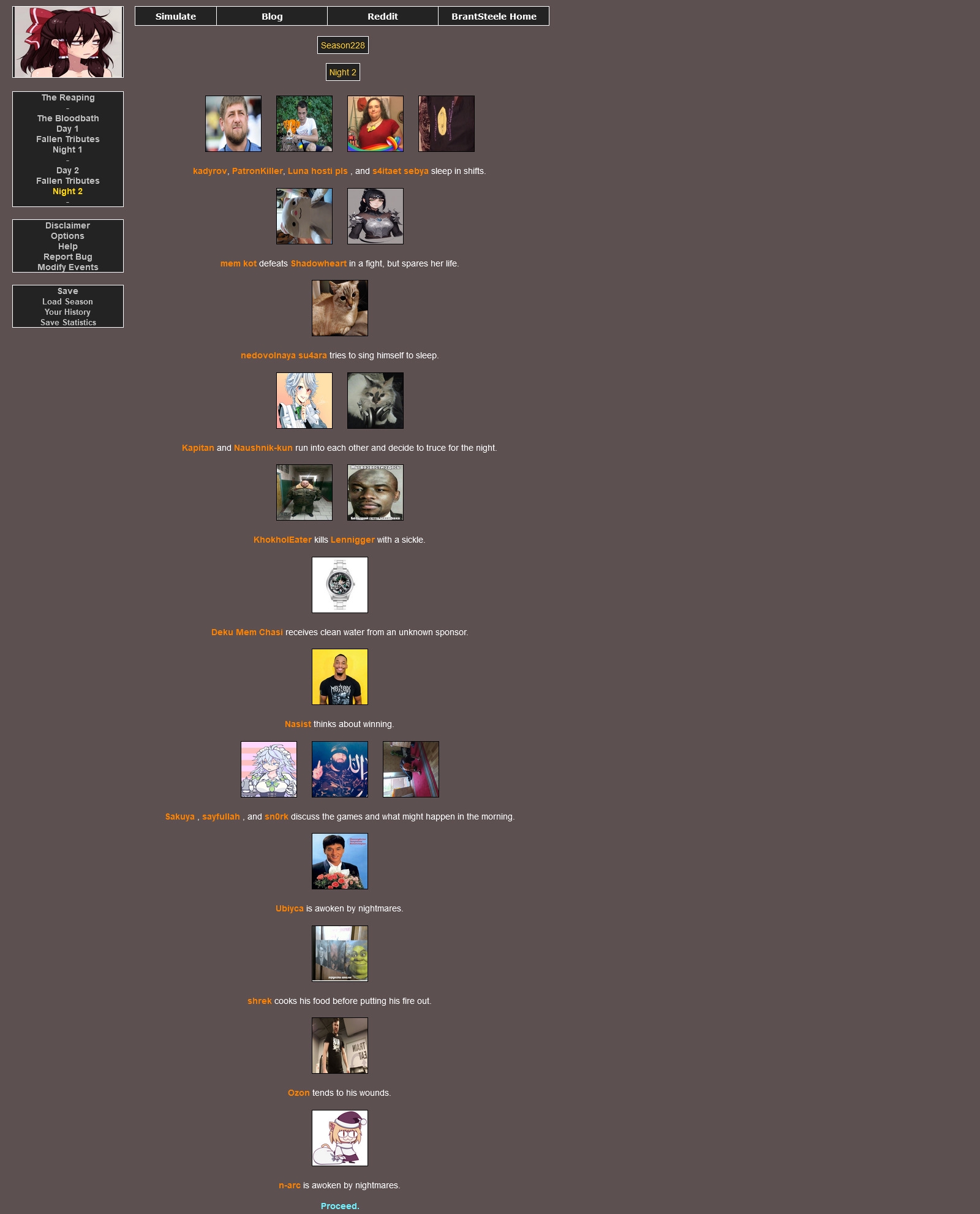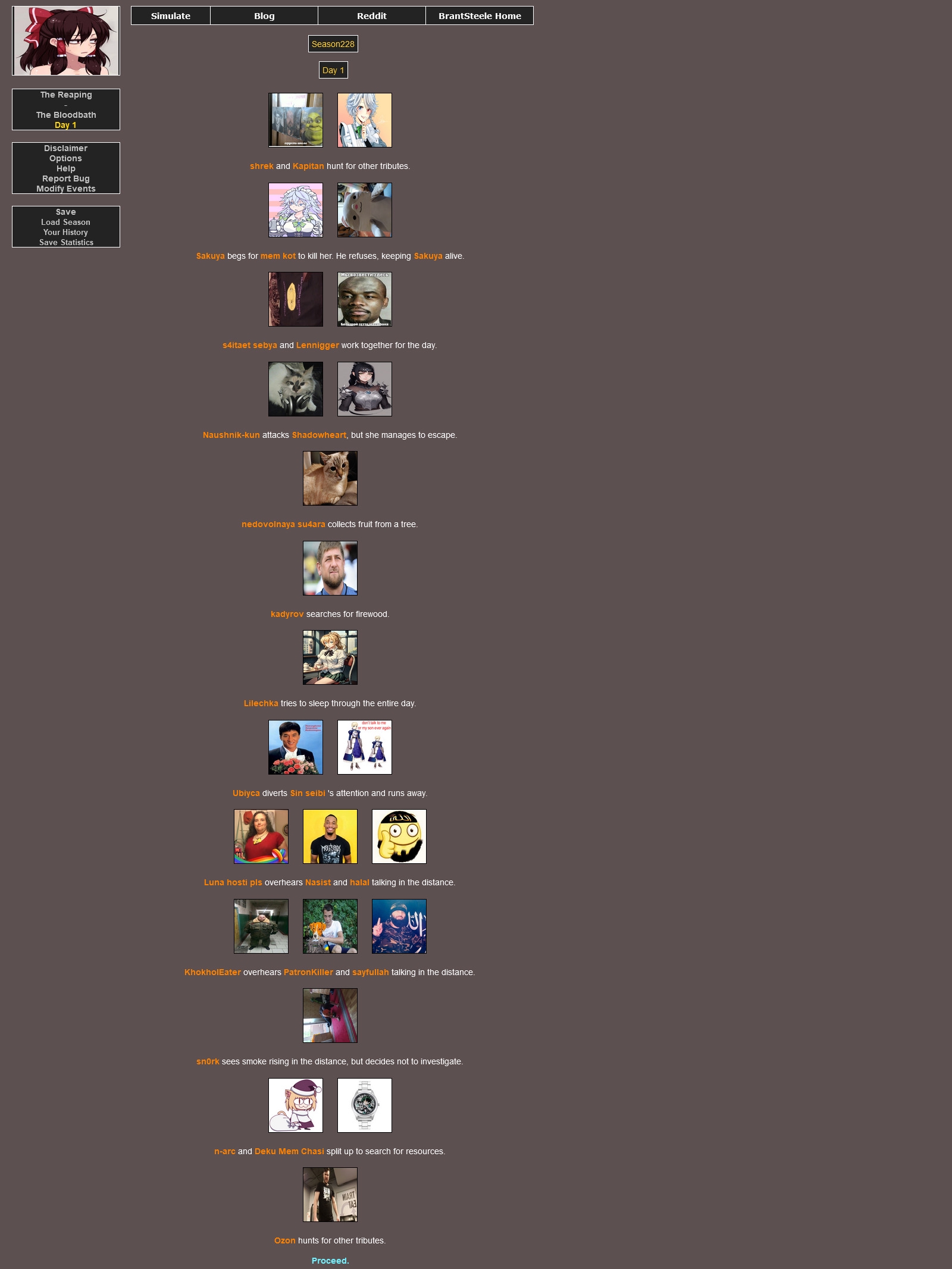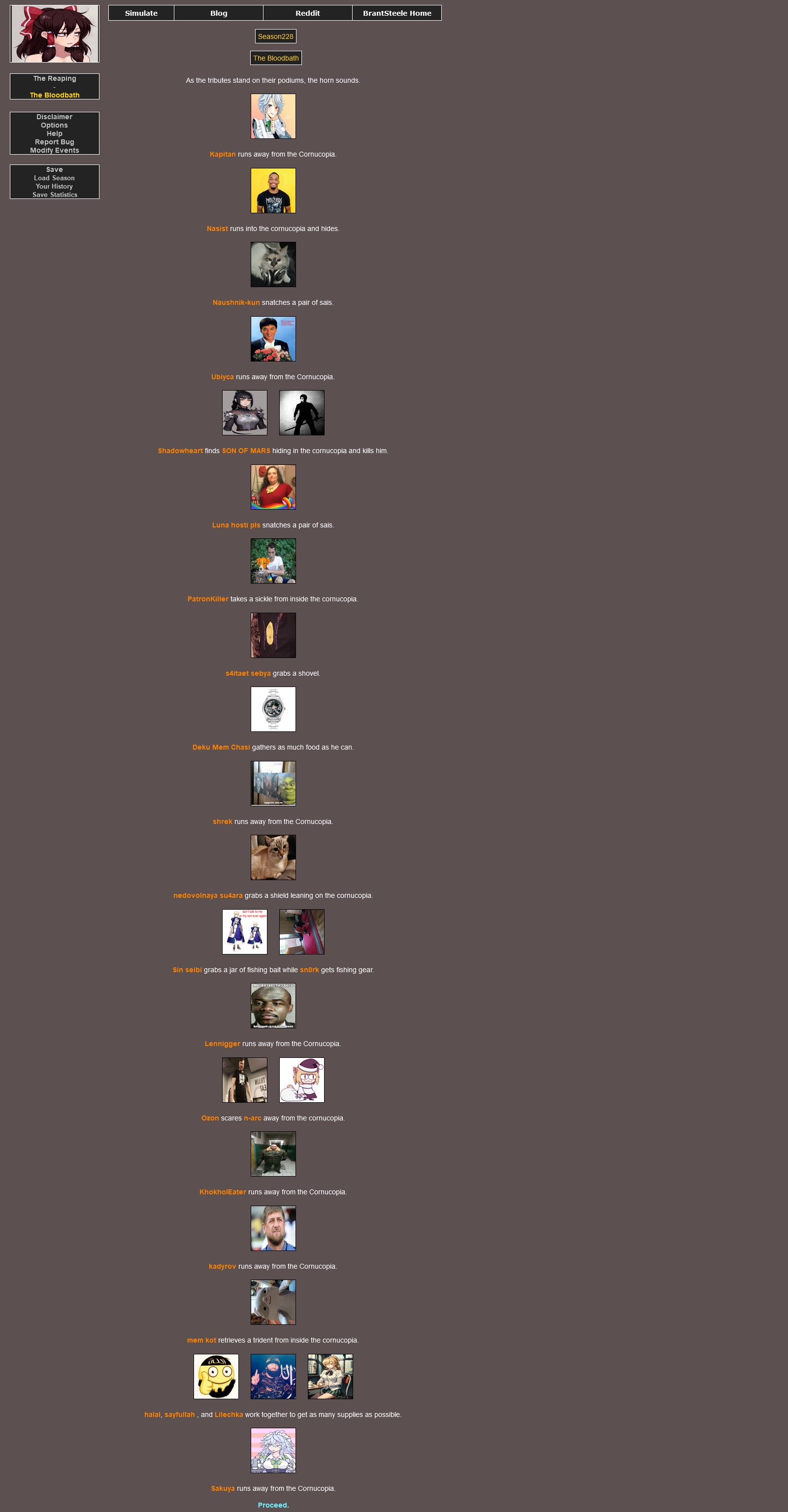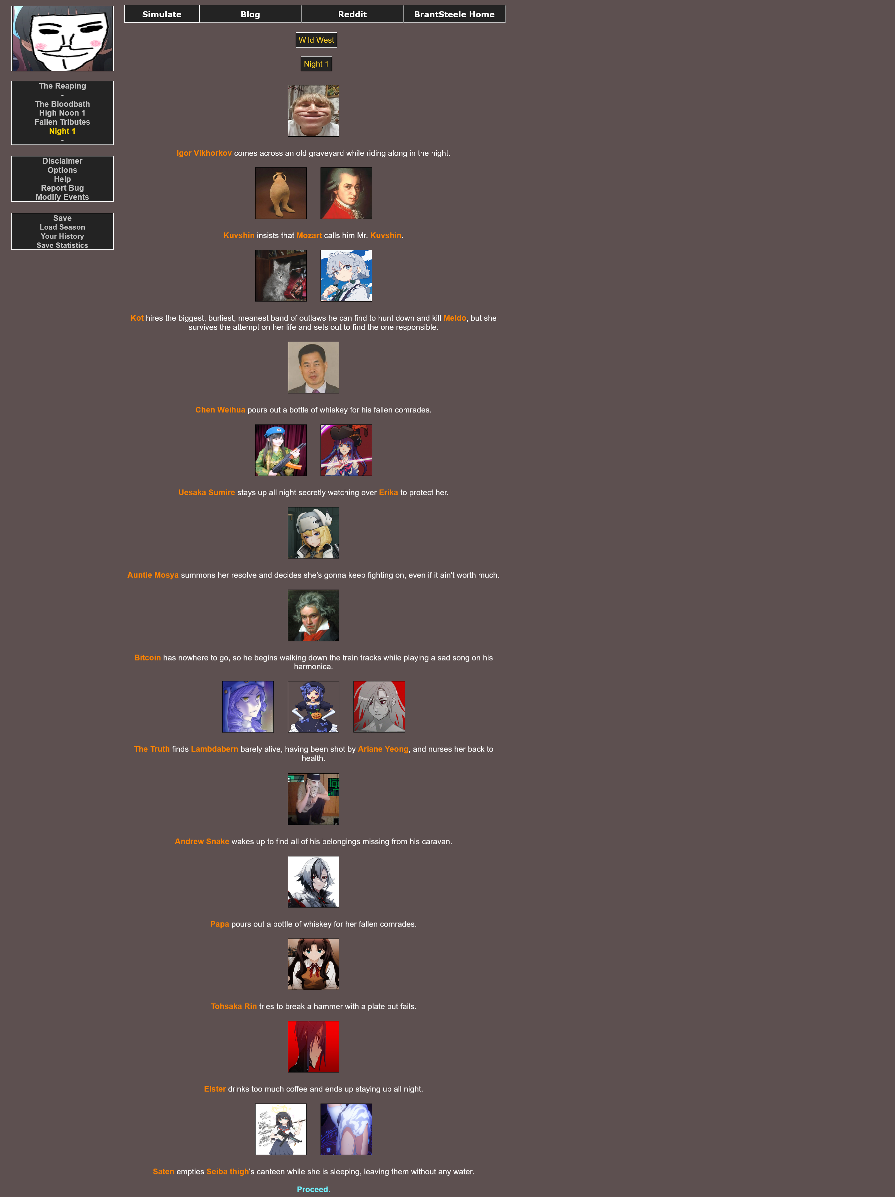 >>1536877 1. Ждёшь, когда хост даст команду на сбор персонажей. Например, как тут >>1536786 2. Вкидываешь в тред имя персонажа + его аватарку, как тут >>1536792 3. Запасаешься попкорном, ждёшь, когда наберётся 24 персонажа на игру в текущих полудохлых реалиях придётся ждать не один день. Затем наблюдаешь за тем, как твой персонаж пробивается к первенству в симуляции Голодных Игр. Ну или скорее получает перо в бочину на первый-второй день. 4. ??? 5. PROFIT!