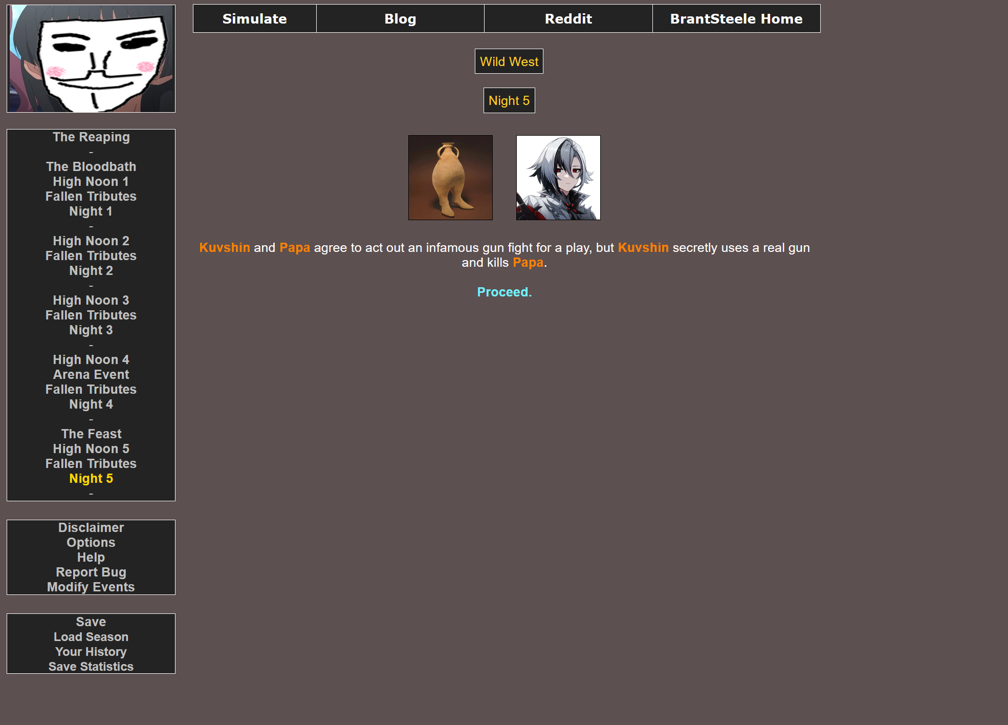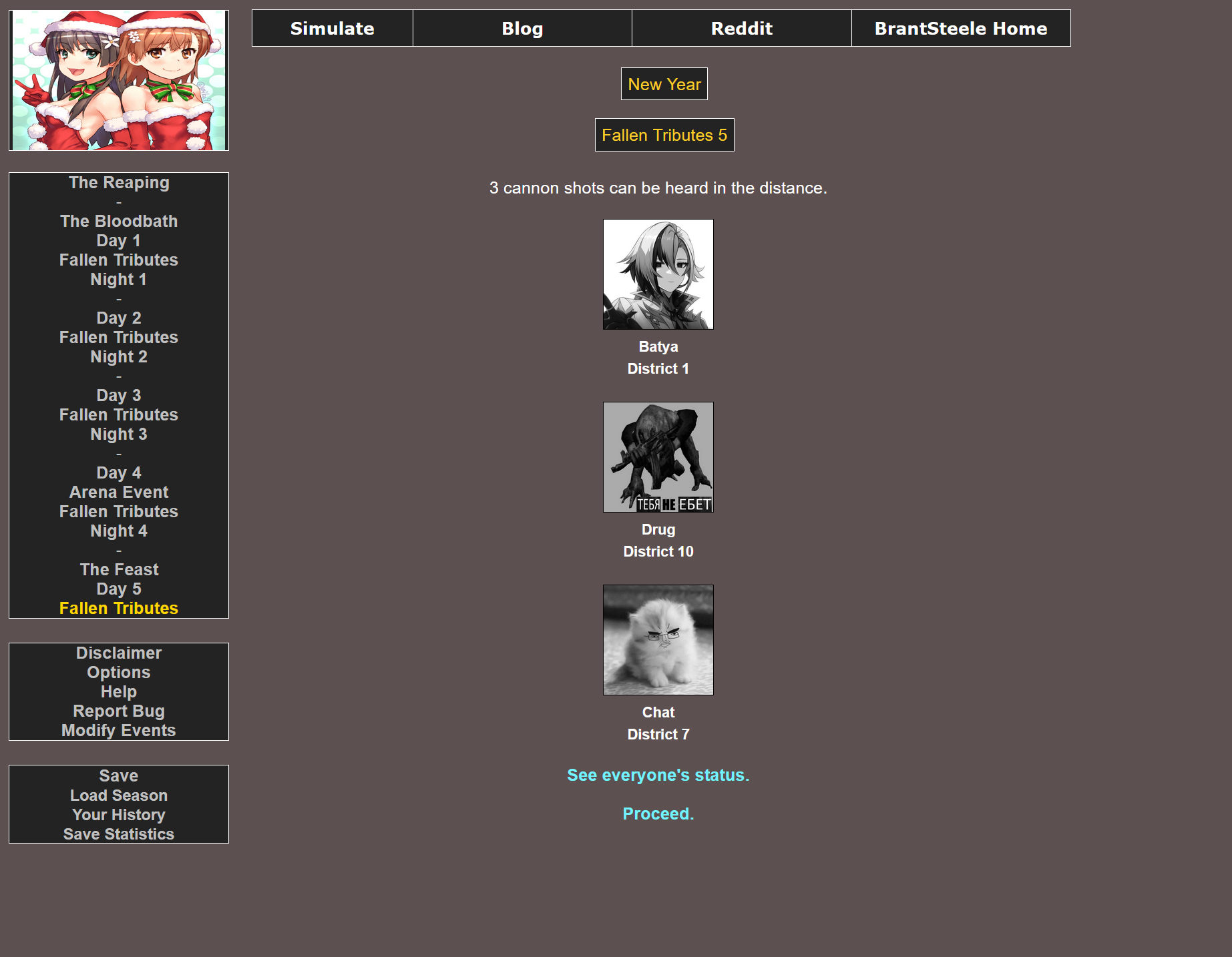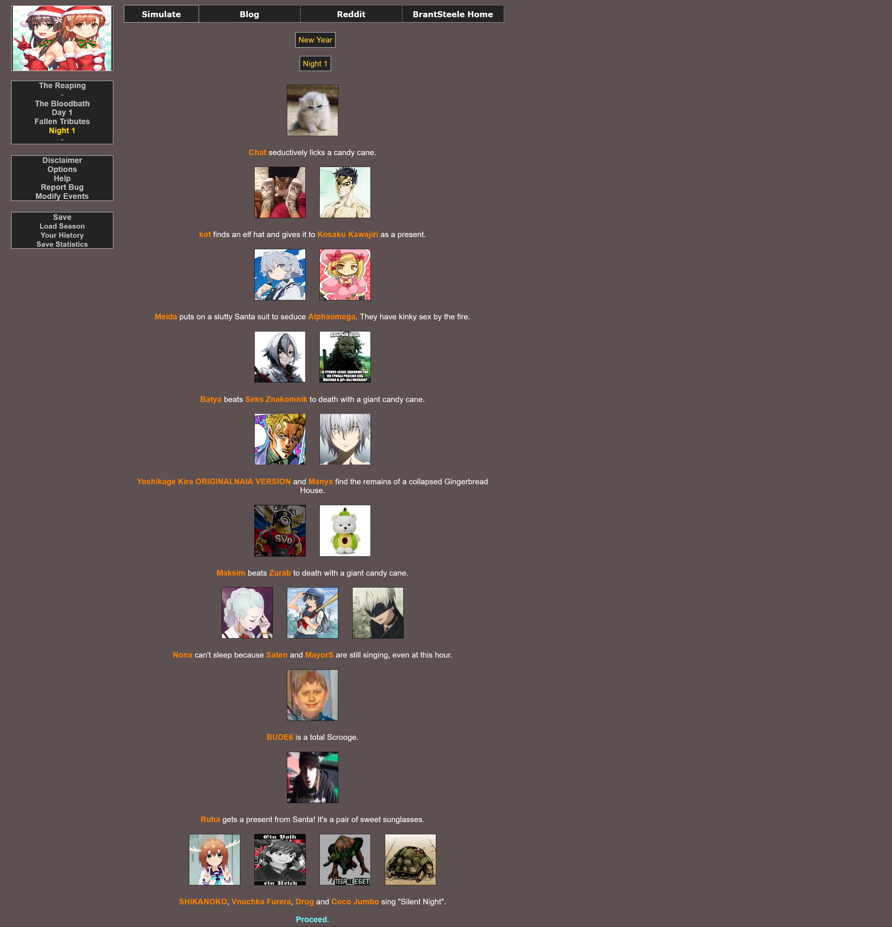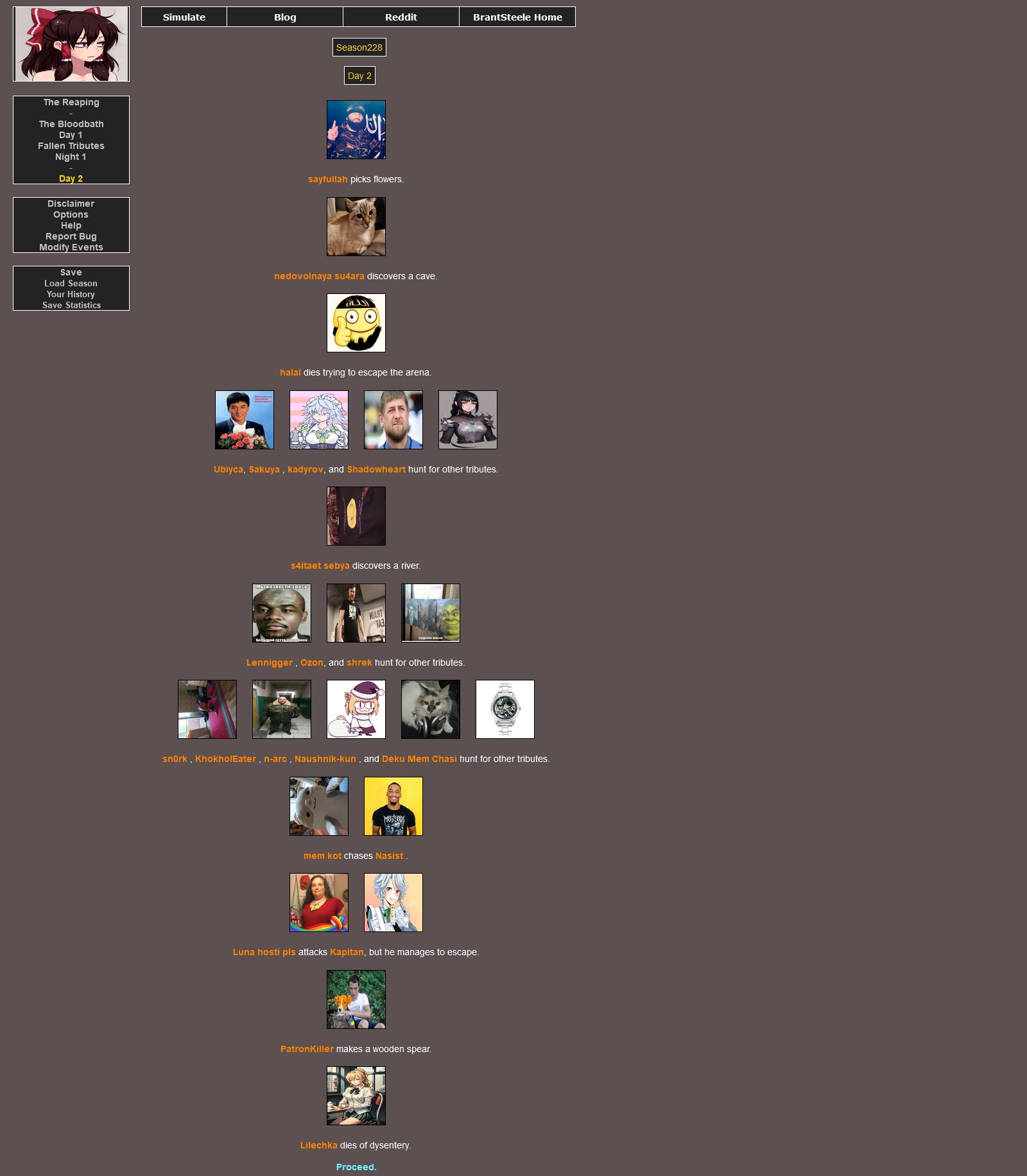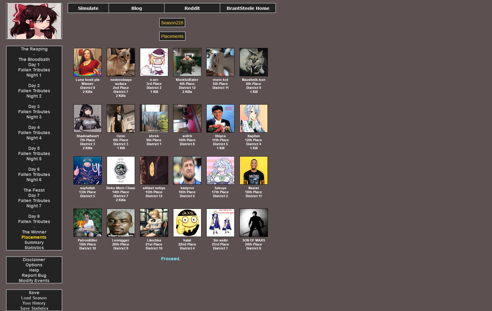 >>1536877 1. Ждёшь, когда хост даст команду на сбор персонажей. Например, как тут >>1536786 2. Вкидываешь в тред имя персонажа + его аватарку, как тут >>1536792 3. Запасаешься попкорном, ждёшь, когда наберётся 24 персонажа на игру в текущих полудохлых реалиях придётся ждать не один день. Затем наблюдаешь за тем, как твой персонаж пробивается к первенству в симуляции Голодных Игр. Ну или скорее получает перо в бочину на первый-второй день. 4. ??? 5. PROFIT!